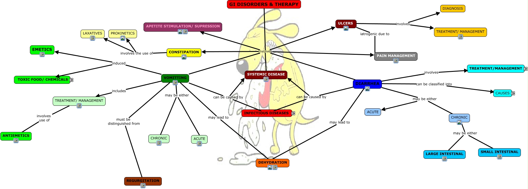 This Concept Map, created with IHMC CmapTools, has information related to: GI DISORDERS & THERAPY, VOMITTING includes TREATMENT/ MANAGEMENT, GI DISORDERS & THERAPY involves CONSTIPATION, INGESTION OF TOXIC FOOD & CHEMICALS such as GRAPES/RAISINS, VOMITTING can be caused by SYSTEMIC DISEASE, TREATMENT/ MANAGEMENT involves ANTIDIARRHOEA DRUGS, DIARRHEA may be either ACUTE, CANINE PARVOVIRUS/ OTHER INFECTIOUS DISEASE includes CLINICAL SIGNS, DIARRHEA may be either CHRONIC, CANINE PARVOVIRUS/ OTHER INFECTIOUS DISEASE includes PATHOPHYSIOLOGY, GI DISORDERS & THERAPY involves PAIN MANAGEMENT, TREATMENT/ MANAGEMENT involves DIETARY MODIFICATION, VOMITTING may be either ACUTE, VOMITTING induced EMETICS, DIARRHEA can be caused by SYSTEMIC DISEASE, CAUSES includes SECRETORY, CANINE PARVOVIRUS/ OTHER INFECTIOUS DISEASE includes LAB DIAGNOSIS, GI DISORDERS & THERAPY involves DIARRHEA, INGESTION OF TOXIC FOOD & CHEMICALS such as CHOCOLATE, CAUSES includes MOTILITY, DIARRHEA can be caused by CANINE PARVOVIRUS/ OTHER INFECTIOUS DISEASE