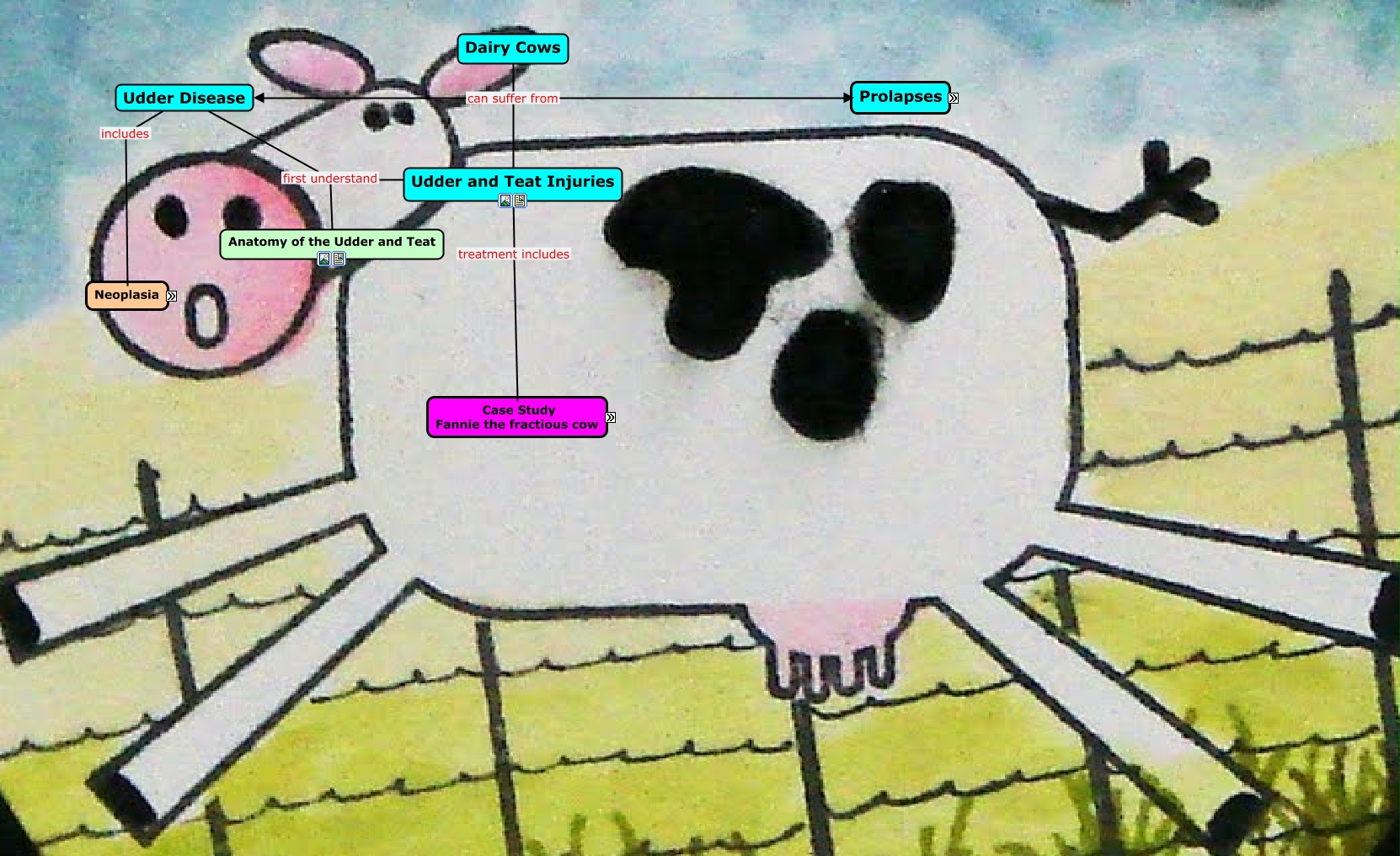 This Concept Map, created with IHMC CmapTools, has information related to: Udder and Teat Surgery, Retention Methods such as Buhner Needle, Surgery includes Post-op, Case Study- Fannie versus The Fence (Spoiler Alert...the fence won) includes History, Prognosis depends on Duration of injury, Treatment followed by Retention Methods, Pre-op includes Nerve blocks, Retention Methods such as Lacing of the vulva, Retention Methods such as Cervicopexy, Retention Methods such as Halsted Pattern, Intra-op includes Complications, Prolapses involves Prognosis, Retention Methods such as Other support methods, Case Study- Fannie versus The Fence (Spoiler Alert...the fence won) includes Treatment Options, Case Study- Fannie versus The Fence (Spoiler Alert...the fence won) includes Client Education, Udder and Teat Injuries first understand Anatomy of the Udder and Teat, Pre-op includes Restraint, Case Study- Fannie versus The Fence (Spoiler Alert...the fence won) includes Surgery, Pre-op includes Physical Examination, Case Study- Fannie versus The Fence (Spoiler Alert...the fence won) includes Diagnosis, Case Study- Fannie versus The Fence (Spoiler Alert...the fence won) includes Signalment