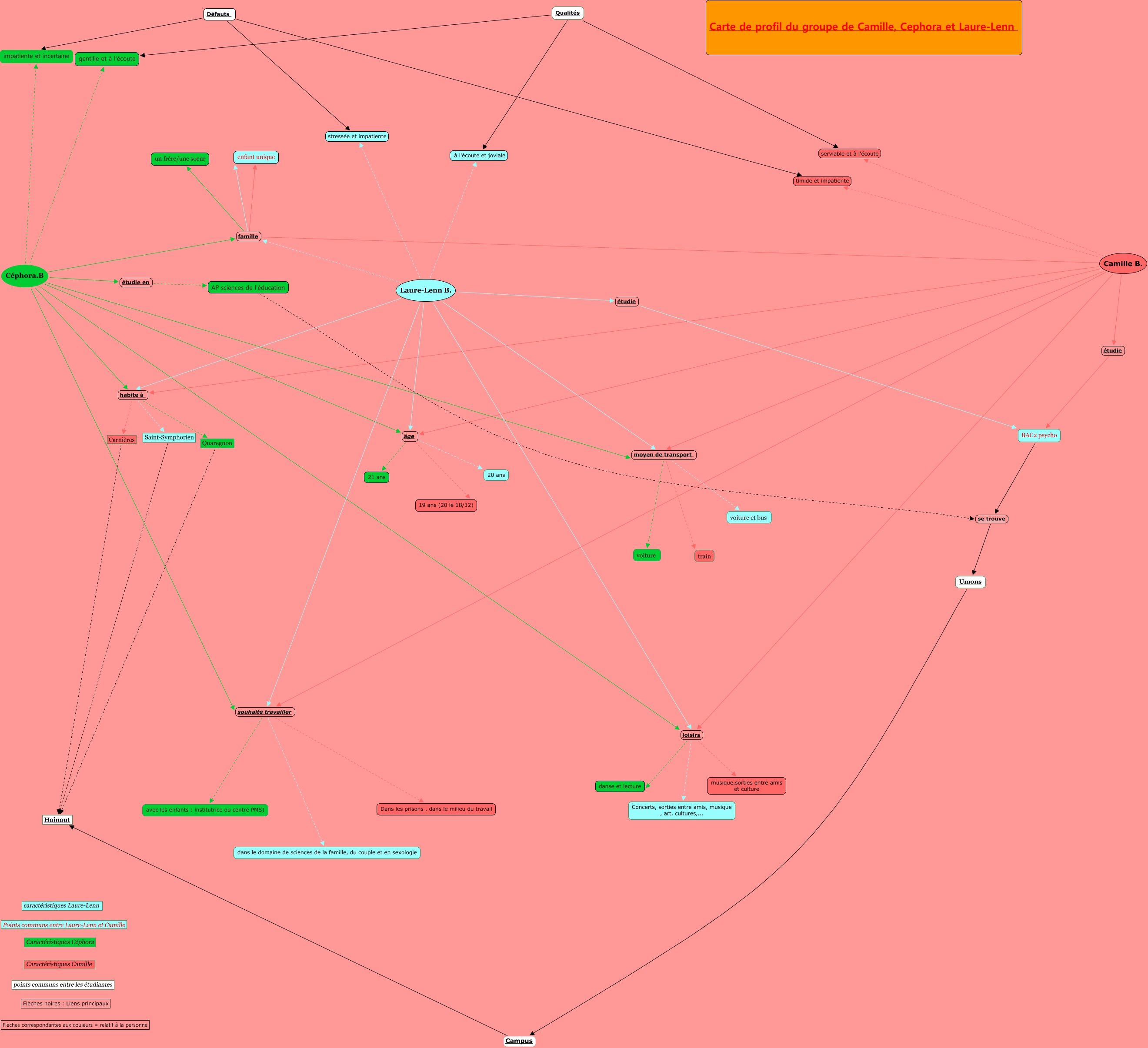Cette carte de concepts créée avec IHMC CmapTools traite de: carte groupe Camille Cephora Laure Lenn, Camille B. habite à Saint-Symphorien, Céphora.B souhaite travailler dans le domaine de sciences de la famille, du couple et en sexologie, Laure-Lenn B. moyen de transport voiture et bus, Laure-Lenn B. habite à Carnières, Laure-Lenn B. habite à Saint-Symphorien, Camille B. étudie BAC2 psycho, Céphora.B souhaite travailler avec les enfants : institutrice ou centre PMS), AP sciences de l'éducation se trouve Umons, Laure-Lenn B. étudie BAC2 psycho, Défauts impatiente et incertaine, Qualités gentille et à l'écoute, Céphora.B impatiente et incertaine, Camille B. famille enfant unique, Camille B. loisirs Concerts, sorties entre amis, musique , art, cultures,..., Céphora.B famille un frère/une soeur, Laure-Lenn B. famille un frère/une soeur, Céphora.B âge 19 ans (20 le 18/12), Céphora.B âge 21 ans, Laure-Lenn B. loisirs danse et lecture, Camille B. âge 21 ans