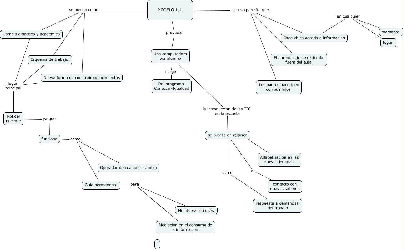 Este Cmap, tiene información relacionada con: Modelo 1.1, se piensa en relacion al contacto con nuevos saberes, MODELO 1.1 su uso permite que Los padres participen con sus hijos, MODELO 1.1 su uso permite que El aprendizaje se extienda fuera del aula., se piensa en relacion como respuesta a demandas del trabajo, Cada chico acceda a informacion en cualquier lugar, MODELO 1.1 se piensa como Nueva forma de construir conocimientos, Cambio didactico y academico lugar principal Rol del docente, Cada chico acceda a informacion en cualquier momento, Nueva forma de construir conocimientos lugar principal Rol del docente, Guia permanente para Mediacion en el consumo de la informacion, Una computadora por alumno la introduccion de las TIC en la escuela se piensa en relacion, MODELO 1.1 su uso permite que Cada chico acceda a informacion, Una computadora por alumno surge Del programa Conectar-Igualdad, Rol del docente ya que funciona, funciona como Guia permanente, se piensa en relacion ???? Alfabetizacion en las nuevas lenguas, funciona como Operador de cualquier cambio, Esquema de trabajo lugar principal Rol del docente, Guia permanente para Monitorear su usos, MODELO 1.1 se piensa como Cambio didactico y academico