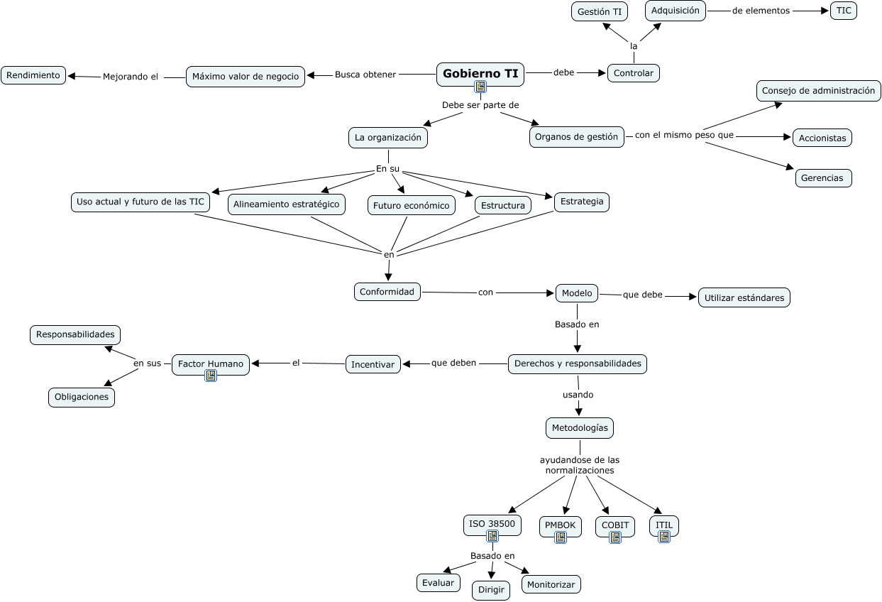 Este Cmap, tiene información relacionada con: Mapa de conceptos - Gobierno y Gestión corporativa, Metodologías ayudandose de las normalizaciones ITIL, ISO 38500 Basado en Dirigir, Uso actual y futuro de las TIC en Conformidad, ISO 38500 Basado en Monitorizar, Metodologías ayudandose de las normalizaciones ISO 38500, Alineamiento estratégico en Conformidad, Adquisición de elementos TIC, Organos de gestión con el mismo peso que Consejo de administración, Metodologías ayudandose de las normalizaciones COBIT, Derechos y responsabilidades que deben Incentivar, Estrategia en Conformidad, La organización En su Estrategia, Factor Humano en sus Obligaciones, Gobierno TI Debe ser parte de Organos de gestión, Máximo valor de negocio Mejorando el Rendimiento, Metodologías ayudandose de las normalizaciones PMBOK, Modelo Basado en Derechos y responsabilidades, ISO 38500 Basado en Evaluar, Gobierno TI Debe ser parte de La organización, Controlar la Gestión TI