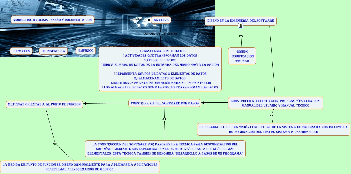 Este Cmap, tiene información relacionada con: unidad 4, modelado, analisis, diseño y documentacion es formales, CONSTRUCCION, CODIFICACION, PRUEBAS Y EVALUACION, MANUAL DEL USUARIO Y MANUAL TECNICO es El desarrollo de una visión conceptual de un sistema de programación incluye la determinación del tipo de sistema a desarrollar, modelado, analisis, diseño y documentacion ???? analisis, DISEÑO EN LA INGENIERÍA DEL SOFTWARE ???? CONSTRUCCION, CODIFICACION, PRUEBAS Y EVALUACION, MANUAL DEL USUARIO Y MANUAL TECNICO, analisis conceptos centrales 1) Transformación de datos Actividades que transforman los datos 2) Flujo de datos: Indica el paso de datos de la entrada del mismo hacia la salida 4 Representa grupos de datos o elementos de datos 3) Almacenamiento de datos: Lugar donde se deja información para su uso posterior Los almacenes de datos son pasivos, no transforman los datos, METRICAS ORIENTAS A AL PUNTO DE FUNCION es La medida de punto de función se diseñó originalmente para aplicarse a aplicaciones de sistemas de información de gestión., analisis ???? DISEÑO EN LA INGENIERÍA DEL SOFTWARE, modelado, analisis, diseño y documentacion es de ingenieria, CONSTRUCCION, CODIFICACION, PRUEBAS Y EVALUACION, MANUAL DEL USUARIO Y MANUAL TECNICO ???? CONSTRUCCION DEL SOFTWARE POR PASOS, CONSTRUCCION DEL SOFTWARE POR PASOS es La construcción del software por pasos es una técnica para descomposición del software mediante sus especificaciones de alto nivel hasta sus niveles más elementales; esta técnica también se denomina “desarrollo a pasos de un programa”, CONSTRUCCION DEL SOFTWARE POR PASOS ???? METRICAS ORIENTAS A AL PUNTO DE FUNCION, DISEÑO EN LA INGENIERÍA DEL SOFTWARE es -diseño -codificacion -prueba, modelado, analisis, diseño y documentacion es empirico