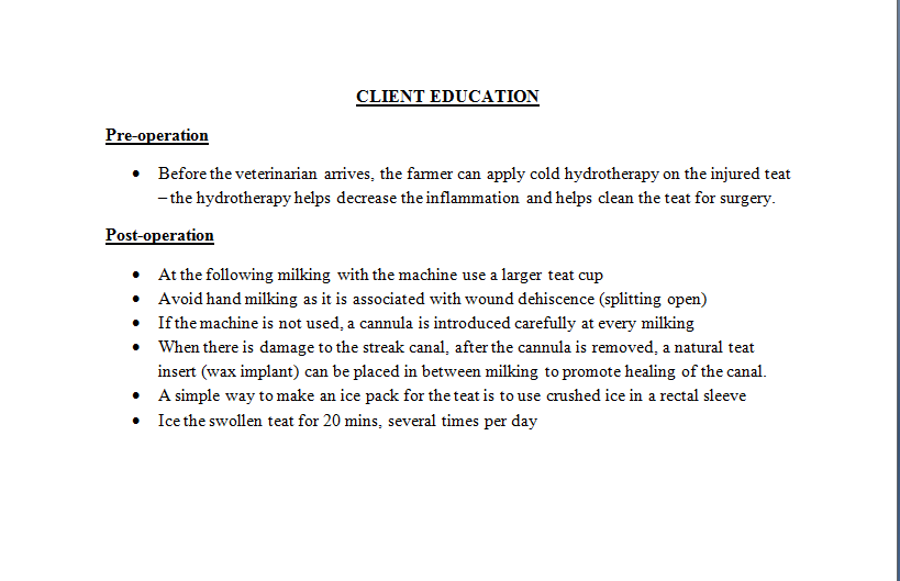 CLASSIFICATION OF TEAT LACERATIONS.pdf Client Education.png COMPLICATIONS.pdf Post Operative Care.png Wound Debridement.png