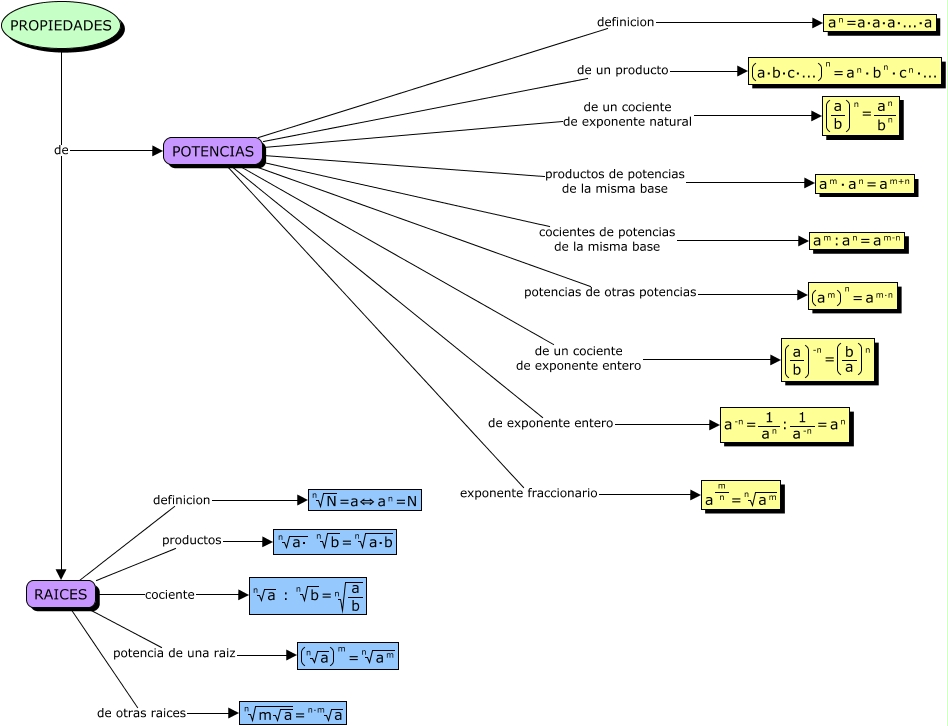 Este Cmap, tiene información relacionada con: FORMULARIO, PROPIEDADES de RAICES, POTENCIAS definicion <math xmlns="http://www.w3.org/1998/Math/MathML"> <mrow> <mmultiscripts> <mtext> a </mtext> <none/> <mtext> n </mtext> </mmultiscripts> <mtext> =a⋅a⋅a⋅...⋅a </mtext> </mrow> </math>, POTENCIAS productos de potencias de la misma base <math xmlns="http://www.w3.org/1998/Math/MathML"> <mrow> <mmultiscripts> <mtext> a </mtext> <none/> <mtext> m </mtext> </mmultiscripts> <mtext> ⋅ </mtext> <mmultiscripts> <mtext> a </mtext> <none/> <mtext> n </mtext> </mmultiscripts> <mtext> = </mtext> <mmultiscripts> <mtext> a </mtext> <none/> <mtext> m+n </mtext> </mmultiscripts> </mrow> </math>, POTENCIAS exponente fraccionario <math xmlns="http://www.w3.org/1998/Math/MathML"> <mmultiscripts> <mtext> a </mtext> <none/> <mfrac> <mtext> m </mtext> <mtext> n </mtext> </mfrac> </mmultiscripts> <mtext> = </mtext> <mroot> <mmultiscripts> <mtext> a </mtext> <none/> <mtext> m </mtext> </mmultiscripts> <mtext> n </mtext> </mroot> </math>, POTENCIAS de un cociente de exponente entero <math xmlns="http://www.w3.org/1998/Math/MathML"> <mrow> <mfenced open="(" close=")"> <mfrac> <mtext> a </mtext> <mtext> b </mtext> </mfrac> </mfenced> <mmultiscripts> <mtext> </mtext> <none/> <mtext> -n </mtext> </mmultiscripts> <mtext> = </mtext> <mfenced open="(" close=")"> <mfrac> <mtext> b </mtext> <mtext> a </mtext> </mfrac> </mfenced> <mmultiscripts> <mtext> </mtext> <none/> <mtext> n </mtext> </mmultiscripts> </mrow> </math>, RAICES definicion <math xmlns="http://www.w3.org/1998/Math/MathML"> <mrow> <mroot> <mtext> N </mtext> <mtext> n </mtext> </mroot> <mtext> =a⇔ </mtext> <mmultiscripts> <mtext> a </mtext> <none/> <mtext> n </mtext> </mmultiscripts> <mtext> =N </mtext> </mrow> </math>, RAICES cociente <math xmlns="http://www.w3.org/1998/Math/MathML"> <mrow> <mroot> <mtext> a </mtext> <mtext> n </mtext> </mroot> <mtext> : </mtext> <mroot> <mtext> b </mtext> <mtext> n </mtext> </mroot> <mtext> = </mtext> <mroot> <mfrac> <mtext> a </mtext> <mtext> b </mtext> </mfrac> <mtext> n </mtext> </mroot> </mrow> </math>, POTENCIAS potencias de otras potencias <math xmlns="http://www.w3.org/1998/Math/MathML"> <mrow> <mfenced open="(" close=")"> <mmultiscripts> <mtext> a </mtext> <none/> <mtext> m </mtext> </mmultiscripts> </mfenced> <mmultiscripts> <mtext> </mtext> <none/> <mtext> n </mtext> </mmultiscripts> <mtext> = </mtext> <mmultiscripts> <mtext> a </mtext> <none/> <mtext> m⋅n </mtext> </mmultiscripts> </mrow> </math>, PROPIEDADES de POTENCIAS, POTENCIAS de un cociente de exponente natural <math xmlns="http://www.w3.org/1998/Math/MathML"> <mrow> <mfenced open="(" close=")"> <mfrac> <mtext> a </mtext> <mtext> b </mtext> </mfrac> </mfenced> <mmultiscripts> <mtext> </mtext> <none/> <mtext> n </mtext> </mmultiscripts> <mtext> = </mtext> <mfrac> <mmultiscripts> <mtext> a </mtext> <none/> <mtext> n </mtext> </mmultiscripts> <mmultiscripts> <mtext> b </mtext> <none/> <mtext> n </mtext> </mmultiscripts> </mfrac> </mrow> </math>, POTENCIAS de un producto <math xmlns="http://www.w3.org/1998/Math/MathML"> <mrow> <mfenced open="(" close=")"> <mtext> a⋅b⋅c⋅... </mtext> </mfenced> <mmultiscripts> <mtext> </mtext> <none/> <mtext> n </mtext> </mmultiscripts> <mtext> = </mtext> <mmultiscripts> <mtext> a </mtext> <none/> <mtext> n </mtext> </mmultiscripts> <mtext> ⋅ </mtext> <mmultiscripts> <mtext> b </mtext> <none/> <mtext> n </mtext> </mmultiscripts> <mtext> ⋅ </mtext> <mmultiscripts> <mtext> c </mtext> <none/> <mtext> n </mtext> </mmultiscripts> <mtext> ⋅... </mtext> </mrow> </math>, POTENCIAS de exponente entero <math xmlns="http://www.w3.org/1998/Math/MathML"> <mrow> <mmultiscripts> <mtext> a </mtext> <none/> <mtext> -n </mtext> </mmultiscripts> <mtext> = </mtext> <mfrac> <mtext> 1 </mtext> <mmultiscripts> <mtext> a </mtext> <none/> <mtext> n </mtext> </mmultiscripts> </mfrac> <mtext> : </mtext> <mfrac> <mtext> 1 </mtext> <mmultiscripts> <mtext> a </mtext> <none/> <mtext> -n </mtext> </mmultiscripts> </mfrac> <mtext> = </mtext> <mmultiscripts> <mtext> a </mtext> <none/> <mtext> n </mtext> </mmultiscripts> </mrow> </math>, RAICES productos <math xmlns="http://www.w3.org/1998/Math/MathML"> <mrow> <mroot> <mtext> a⋅ </mtext> <mtext> n </mtext> </mroot> <mtext> </mtext> <mroot> <mtext> b </mtext> <mtext> n </mtext> </mroot> <mtext> = </mtext> <mroot> <mtext> a⋅b </mtext> <mtext> n </mtext> </mroot> </mrow> </math>, RAICES potencia de una raiz <math xmlns="http://www.w3.org/1998/Math/MathML"> <mrow> <mfenced open="(" close=")"> <mroot> <mtext> a </mtext> <mtext> n </mtext> </mroot> </mfenced> <mmultiscripts> <mtext> </mtext> <none/> <mtext> m </mtext> </mmultiscripts> <mtext> = </mtext> <mroot> <mmultiscripts> <mtext> a </mtext> <none/> <mtext> m </mtext> </mmultiscripts> <mtext> n </mtext> </mroot> </mrow> </math>, POTENCIAS cocientes de potencias de la misma base <math xmlns="http://www.w3.org/1998/Math/MathML"> <mrow> <mmultiscripts> <mtext> a </mtext> <none/> <mtext> m </mtext> </mmultiscripts> <mtext> : </mtext> <mmultiscripts> <mtext> a </mtext> <none/> <mtext> n </mtext> </mmultiscripts> <mtext> = </mtext> <mmultiscripts> <mtext> a </mtext> <none/> <mtext> m-n </mtext> </mmultiscripts> </mrow> </math>, RAICES de otras raices <math xmlns="http://www.w3.org/1998/Math/MathML"> <mrow> <mroot> <mrow> <mtext> m </mtext> <msqrt> <mtext> a </mtext> </msqrt> </mrow> <mtext> n </mtext> </mroot> <mtext> = </mtext> <mroot> <mtext> a </mtext> <mtext> n⋅m </mtext> </mroot> </mrow> </math>