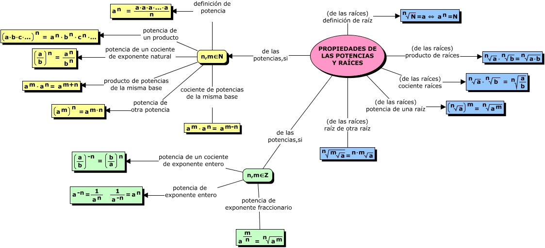 Este Cmap, tiene información relacionada con: Propiedades de las potencias y raíces, PROPIEDADES DE LAS POTENCIAS Y RAÍCES (de las raíces) cociente raíces <math xmlns="http://www.w3.org/1998/Math/MathML"> <mrow> <mroot> <mtext> a </mtext> <mtext> n </mtext> </mroot> <mtext> ⋅ </mtext> <mroot> <mtext> b </mtext> <mtext> n </mtext> </mroot> <mtext> = </mtext> <mroot> <mfrac> <mtext> a </mtext> <mtext> b </mtext> </mfrac> <mtext> n </mtext> </mroot> </mrow> </math>, PROPIEDADES DE LAS POTENCIAS Y RAÍCES (de las raíces) potencia de una raíz <math xmlns="http://www.w3.org/1998/Math/MathML"> <mrow> <mfenced open="(" close=")"> <mroot> <mtext> a </mtext> <mtext> n </mtext> </mroot> </mfenced> <mmultiscripts> <mtext> </mtext> <none/> <mtext> m </mtext> </mmultiscripts> <mtext> = </mtext> <mroot> <mmultiscripts> <mtext> a </mtext> <none/> <mtext> m </mtext> </mmultiscripts> <mtext> n </mtext> </mroot> </mrow> </math>, n,m∈Z potencia de un cociente de exponente entero <math xmlns="http://www.w3.org/1998/Math/MathML"> <mrow> <mfenced open="(" close=")"> <mfrac> <mtext> a </mtext> <mtext> b </mtext> </mfrac> </mfenced> <mmultiscripts> <mtext> </mtext> <none/> <mtext> -n </mtext> </mmultiscripts> <mtext> = </mtext> <mfenced open="(" close=")"> <mfrac> <mtext> b </mtext> <mtext> a </mtext> </mfrac> </mfenced> <mmultiscripts> <mtext> </mtext> <none/> <mtext> n </mtext> </mmultiscripts> </mrow> </math>, PROPIEDADES DE LAS POTENCIAS Y RAÍCES (de las raíces) definición de raíz <math xmlns="http://www.w3.org/1998/Math/MathML"> <mrow> <mroot> <mtext> N </mtext> <mtext> n </mtext> </mroot> <mtext> =a ⇔ </mtext> <mmultiscripts> <mtext> a </mtext> <none/> <mtext> n </mtext> </mmultiscripts> <mtext> =N </mtext> </mrow> </math>, PROPIEDADES DE LAS POTENCIAS Y RAÍCES (de las raíces) raíz de otra raíz <math xmlns="http://www.w3.org/1998/Math/MathML"> <mrow> <mroot> <mroot> <mtext> a </mtext> <mtext> m </mtext> </mroot> <mtext> n </mtext> </mroot> <mtext> = </mtext> <mroot> <mtext> a </mtext> <mtext> n⋅m </mtext> </mroot> </mrow> </math>, n,m∈N definición de potencia <math xmlns="http://www.w3.org/1998/Math/MathML"> <mrow> <mmultiscripts> <mtext> a </mtext> <none/> <mtext> n </mtext> </mmultiscripts> <mtext> = </mtext> <mfrac> <mtext> a⋅a⋅a⋅...⋅a </mtext> <mtext> n </mtext> </mfrac> </mrow> </math>, n,m∈Z potencia de exponente entero <math xmlns="http://www.w3.org/1998/Math/MathML"> <mrow> <mmultiscripts> <mtext> a </mtext> <none/> <mtext> -n </mtext> </mmultiscripts> <mtext> = </mtext> <mfrac> <mtext> 1 </mtext> <mmultiscripts> <mtext> a </mtext> <none/> <mtext> n </mtext> </mmultiscripts> </mfrac> <mtext> </mtext> <mfrac> <mtext> 1 </mtext> <mmultiscripts> <mtext> a </mtext> <none/> <mtext> -n </mtext> </mmultiscripts> </mfrac> <mtext> = </mtext> <mmultiscripts> <mtext> a </mtext> <none/> <mtext> n </mtext> </mmultiscripts> </mrow> </math>, PROPIEDADES DE LAS POTENCIAS Y RAÍCES de las potencias,si n,m∈Z, n,m∈N potencia de otra potencia <math xmlns="http://www.w3.org/1998/Math/MathML"> <mrow> <mfenced open="(" close=")"> <mmultiscripts> <mtext> a </mtext> <none/> <mtext> m </mtext> </mmultiscripts> </mfenced> <mmultiscripts> <mtext> </mtext> <none/> <mtext> n </mtext> </mmultiscripts> <mtext> = </mtext> <mmultiscripts> <mtext> a </mtext> <none/> <mtext> m⋅n </mtext> </mmultiscripts> </mrow> </math>, PROPIEDADES DE LAS POTENCIAS Y RAÍCES (de las raíces) producto de raíces <math xmlns="http://www.w3.org/1998/Math/MathML"> <mrow> <mroot> <mtext> a </mtext> <mtext> n </mtext> </mroot> <mtext> ⋅ </mtext> <mroot> <mtext> b </mtext> <mtext> n </mtext> </mroot> <mtext> = </mtext> <mroot> <mtext> a⋅b </mtext> <mtext> n </mtext> </mroot> </mrow> </math>, n,m∈N producto de potencias de la misma base <math xmlns="http://www.w3.org/1998/Math/MathML"> <mrow> <mmultiscripts> <mtext> a </mtext> <none/> <mtext> m </mtext> </mmultiscripts> <mtext> ⋅ </mtext> <mmultiscripts> <mtext> a </mtext> <none/> <mtext> n </mtext> </mmultiscripts> <mtext> = </mtext> <mmultiscripts> <mtext> a </mtext> <none/> <mtext> m+n </mtext> </mmultiscripts> </mrow> </math>, n,m∈N cociente de potencias de la misma base <math xmlns="http://www.w3.org/1998/Math/MathML"> <mrow> <mmultiscripts> <mtext> a </mtext> <none/> <mtext> m </mtext> </mmultiscripts> <mtext> ⋅ </mtext> <mmultiscripts> <mtext> a </mtext> <none/> <mtext> n </mtext> </mmultiscripts> <mtext> = </mtext> <mmultiscripts> <mtext> a </mtext> <none/> <mtext> m-n </mtext> </mmultiscripts> </mrow> </math>, PROPIEDADES DE LAS POTENCIAS Y RAÍCES de las potencias,si n,m∈N, n,m∈Z potencia de exponente fraccionario <math xmlns="http://www.w3.org/1998/Math/MathML"> <mrow> <mmultiscripts> <mtext> a </mtext> <none/> <mfrac> <mtext> m </mtext> <mtext> n </mtext> </mfrac> </mmultiscripts> <mtext> = </mtext> <mroot> <mmultiscripts> <mtext> a </mtext> <none/> <mtext> m </mtext> </mmultiscripts> <mtext> n </mtext> </mroot> </mrow> </math>, n,m∈N potencia de un cociente de exponente natural <math xmlns="http://www.w3.org/1998/Math/MathML"> <mrow> <mfenced open="(" close=")"> <mfrac> <mtext> a </mtext> <mtext> b </mtext> </mfrac> </mfenced> <mmultiscripts> <mtext> </mtext> <none/> <mtext> n </mtext> </mmultiscripts> <mtext> = </mtext> <mfrac> <mmultiscripts> <mtext> a </mtext> <none/> <mtext> n </mtext> </mmultiscripts> <mmultiscripts> <mtext> b </mtext> <none/> <mtext> n </mtext> </mmultiscripts> </mfrac> </mrow> </math>, n,m∈N potencia de un producto <math xmlns="http://www.w3.org/1998/Math/MathML"> <mrow> <mfenced open="(" close=")"> <mtext> a⋅b⋅c⋅... </mtext> </mfenced> <mmultiscripts> <mtext> </mtext> <none/> <mtext> n </mtext> </mmultiscripts> <mtext> = </mtext> <mmultiscripts> <mtext> a </mtext> <none/> <mtext> n </mtext> </mmultiscripts> <mtext> ⋅ </mtext> <mmultiscripts> <mtext> b </mtext> <none/> <mtext> n </mtext> </mmultiscripts> <mtext> ⋅ </mtext> <mmultiscripts> <mtext> c </mtext> <none/> <mtext> n </mtext> </mmultiscripts>