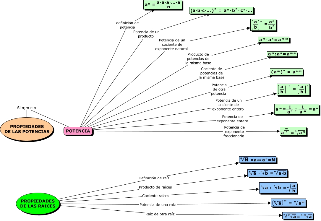 Este Cmap, tiene información relacionada con: ESO2-BORJA_BAÑON-CMAP_ FORMULARIO, PROPIEDADES DE LAS RAICES Cociente raíces <math xmlns="http://www.w3.org/1998/Math/MathML"> <mrow> <mroot> <mtext> a </mtext> <mtext> n </mtext> </mroot> <mtext> : </mtext> <mroot> <mtext> b </mtext> <mtext> n </mtext> </mroot> <mtext> = </mtext> <mroot> <mfrac> <mtext> a </mtext> <mtext> b </mtext> </mfrac> <mtext> n </mtext> </mroot> </mrow> </math>, POTENCIA Potencia de un cociente de exponente natural <math xmlns="http://www.w3.org/1998/Math/MathML"> <mrow> <mfenced open="(" close=")"> <mfrac> <mtext> a </mtext> <mtext> b </mtext> </mfrac> </mfenced> <mmultiscripts> <mtext> </mtext> <none/> <mtext> n </mtext> </mmultiscripts> <mtext> = </mtext> <mfrac> <mmultiscripts> <mtext> a </mtext> <none/> <mtext> n </mtext> </mmultiscripts> <mmultiscripts> <mtext> b </mtext> <none/> <mtext> n </mtext> </mmultiscripts> </mfrac> </mrow> </math>, POTENCIA Cociente de potencias de la misma base <math xmlns="http://www.w3.org/1998/Math/MathML"> <mrow> <mmultiscripts> <mtext> a </mtext> <none/> <mtext> m </mtext> </mmultiscripts> <mtext> : </mtext> <mmultiscripts> <mtext> a </mtext> <none/> <mtext> n </mtext> </mmultiscripts> <mtext> = </mtext> <mmultiscripts> <mtext> a </mtext> <none/> <mtext> m-n </mtext> </mmultiscripts> </mrow> </math>, POTENCIA Potencia de otra potencia <math xmlns="http://www.w3.org/1998/Math/MathML"> <mrow> <mtext> ( </mtext> <mmultiscripts> <mtext> a </mtext> <none/> <mtext> m </mtext> </mmultiscripts> <mmultiscripts> <mtext> ) </mtext> <none/> <mtext> n </mtext> </mmultiscripts> <mtext> = </mtext> <mmultiscripts> <mtext> a </mtext> <none/> <mtext> n⋅m </mtext> </mmultiscripts> </mrow> </math>, PROPIEDADES DE LAS RAICES Producto de raíces <math xmlns="http://www.w3.org/1998/Math/MathML"> <mrow> <mroot> <mtext> a </mtext> <mtext> n </mtext> </mroot> <mtext> ⋅ </mtext> <mroot> <mtext> b </mtext> <mtext> n </mtext> </mroot> <mtext> = </mtext> <mroot> <mtext> a⋅b </mtext> <mtext> n </mtext> </mroot> </mrow> </math>, PROPIEDADES DE LAS POTENCIAS Si n;m e n POTENCIA, PROPIEDADES DE LAS RAICES Raíz de otra raíz <math xmlns="http://www.w3.org/1998/Math/MathML"> <mrow> <mroot> <mroot> <mtext> a </mtext> <mtext> m </mtext> </mroot> <mtext> n </mtext> </mroot> <mtext> = </mtext> <mroot> <mtext> a </mtext> <mtext> n⋅m </mtext> </mroot> </mrow> </math>, PROPIEDADES DE LAS RAICES Definición de raíz <math xmlns="http://www.w3.org/1998/Math/MathML"> <mrow> <mroot> <mtext> N </mtext> <mtext> n </mtext> </mroot> <mtext> =a⇔ </mtext> <mmultiscripts> <mtext> a </mtext> <none/> <mtext> n </mtext> </mmultiscripts> <mtext> =N </mtext> </mrow> </math>, POTENCIA definición de potencia <math xmlns="http://www.w3.org/1998/Math/MathML"> <mrow> <mmultiscripts> <mtext> a </mtext> <none/> <mtext> n </mtext> </mmultiscripts> <mtext> = </mtext> <mfrac> <mtext> a⋅a⋅a⋅...⋅a </mtext> <mtext> n </mtext> </mfrac> </mrow> </math>, POTENCIA Potencia de exponente fraccionario <math xmlns="http://www.w3.org/1998/Math/MathML"> <mmultiscripts> <mtext> a </mtext> <none/> <mfrac> <mtext> m </mtext> <mtext> n </mtext> </mfrac> </mmultiscripts> <mtext> = </mtext> <mroot> <mmultiscripts> <mtext> a </mtext> <none/> <mtext> m </mtext> </mmultiscripts> <mtext> n </mtext> </mroot> </math>, POTENCIA Potencia de un cociente de exponente entero <math xmlns="http://www.w3.org/1998/Math/MathML"> <mrow> <mfenced open="(" close=")"> <mfrac> <mtext> a </mtext> <mtext> b </mtext> </mfrac> </mfenced> <mmultiscripts> <mtext> </mtext> <none/> <mtext> - n </mtext> </mmultiscripts> <mtext> = </mtext> <mfenced open="(" close=")"> <mfrac> <mtext> a </mtext> <mtext> b </mtext> </mfrac> </mfenced> <mmultiscripts> <mtext> </mtext> <none/> <mtext> n </mtext> </mmultiscripts> </mrow> </math>, PROPIEDADES DE LAS RAICES Potencia de una raíz <math xmlns="http://www.w3.org/1998/Math/MathML"> <mrow> <mfenced open="(" close=")"> <mroot> <mtext> a </mtext> <mtext> n </mtext> </mroot> </mfenced> <mmultiscripts> <mtext> </mtext> <none/> <mtext> m </mtext> </mmultiscripts> <mtext> = </mtext> <mroot> <mmultiscripts> <mtext> a </mtext> <none/> <mtext> m </mtext> </mmultiscripts> <mtext> n </mtext> </mroot> </mrow> </math>, POTENCIA Producto de potencias de la misma base <math xmlns="http://www.w3.org/1998/Math/MathML"> <mrow> <mmultiscripts> <mtext> a </mtext> <none/> <mtext> m </mtext> </mmultiscripts> <mtext> ⋅ </mtext> <mmultiscripts> <mtext> a </mtext> <none/> <mtext> n </mtext> </mmultiscripts> <mtext> = </mtext> <mmultiscripts> <mtext> a </mtext> <none/> <mtext> m+n </mtext> </mmultiscripts> </mrow> </math>, POTENCIA Potencia de un producto <math xmlns="http://www.w3.org/1998/Math/MathML"> <mrow> <mtext> (a⋅b⋅c⋅... </mtext> <mmultiscripts> <mtext> ) </mtext> <none/> <mtext> n </mtext> </mmultiscripts> <mtext> = </mtext> <mmultiscripts> <mtext> a </mtext> <none/> <mtext> n </mtext> </mmultiscripts> <mtext> ⋅ </mtext> <mmultiscripts> <mtext> b </mtext> <none/> <mtext> n </mtext> </mmultiscripts> <mtext> ⋅ </mtext> <mmultiscripts> <mtext> c </mtext> <none/> <mtext> n </mtext> </mmultiscripts> <mtext> ⋅... </mtext> </mrow> </math>, POTENCIA Potencia de exponente entero <math xmlns="http://www.w3.org/1998/Math/MathML"> <mrow> <mmultiscripts> <mtext> a </mtext> <none/> <mtext> -n </mtext> </mmultiscripts> <mtext> = </mtext> <mfrac> <mtext> 1 </mtext> <mmultiscripts> <mtext> a </mtext> <none/> <mtext> n </mtext> </mmultiscripts> </mfrac> <mtext> ; </mtext> <mfrac> <mtext> 1 </mtext> <mmultiscripts> <mtext> a </mtext> <none/> <mtext> -n </mtext> </mmultiscripts> </mfrac> <mtext> = </mtext> <mmultiscripts> <mtext> a </mtext> <none/> <mtext> n </mtext> </mmultiscripts> </mrow> </math>