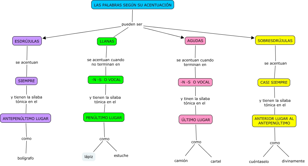 Este Cmap, tiene información relacionada con: LAS PALABRAS SEGÚN SE ACENTUAN-Lucía G, AGUDAS se acentuan cuando terminan en -N -S O VOCAL, PENÚLTIMO LUGAR como lápiz, -N -S O VOCAL y tienen la sílaba tónica en el PENÚLTIMO LUGAR, ÚLTIMO LUGAR como cartel, PENÚLTIMO LUGAR como estuche, SIEMPRE y tienen la sílaba tónica en el ANTEPENÚLTIMO LUGAR, LAS PALABRAS SEGÚN SU ACENTUACIÓN pueden ser LLANAS, LLANAS se acentuan cuando no terminan en -N -S O VOCAL, -N -S O VOCAL y tinen la sílaba tónica en el ÚLTIMO LUGAR, LAS PALABRAS SEGÚN SU ACENTUACIÓN pueden ser ESDRÚJULAS, ESDRÚJULAS se acentuan SIEMPRE, ANTERIOR LUGAR AL ANTEPENÚLTIMO como cuéntaselo, LAS PALABRAS SEGÚN SU ACENTUACIÓN pueden ser AGUDAS, ÚLTIMO LUGAR como camión, SOBRESDRÚJULAS se acentuan CASI SIEMPRE, ANTEPENÚLTIMO LUGAR como bolígrafo, ANTERIOR LUGAR AL ANTEPENÚLTIMO como divinamente, LAS PALABRAS SEGÚN SU ACENTUACIÓN pueden ser SOBRESDRÚJULAS, CASI SIEMPRE y tienen la sílaba tónica en el ANTERIOR LUGAR AL ANTEPENÚLTIMO