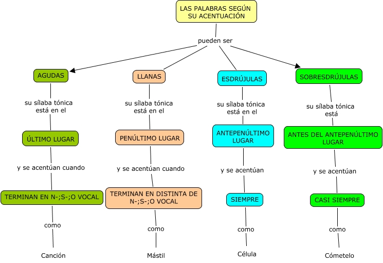 Este Cmap, tiene información relacionada con: LAS PALABRAS SEGÚN SU ACENTUACIÓN-Carlos, LAS PALABRAS SEGÚN SU ACENTUACIÓN pueden ser AGUDAS, ANTES DEL ANTEPENÚLTIMO LUGAR y se acentúan CASI SIEMPRE, LAS PALABRAS SEGÚN SU ACENTUACIÓN pueden ser SOBRESDRÚJULAS, SIEMPRE como Célula, TERMINAN EN DISTINTA DE N-;S-;O VOCAL como Mástil, TERMINAN EN N-;S-;O VOCAL como Canción, ESDRÚJULAS su sílaba tónica está en el ANTEPENÚLTIMO LUGAR, ÚLTIMO LUGAR y se acentúan cuando TERMINAN EN N-;S-;O VOCAL, LAS PALABRAS SEGÚN SU ACENTUACIÓN pueden ser ESDRÚJULAS, CASI SIEMPRE como Cómetelo, PENÚLTIMO LUGAR y se acentúan cuando TERMINAN EN DISTINTA DE N-;S-;O VOCAL, SOBRESDRÚJULAS su sílaba tónica está ANTES DEL ANTEPENÚLTIMO LUGAR, ANTEPENÚLTIMO LUGAR y se acentúan SIEMPRE, LLANAS su sílaba tónica está en el PENÚLTIMO LUGAR, AGUDAS su sílaba tónica está en el ÚLTIMO LUGAR, LAS PALABRAS SEGÚN SU ACENTUACIÓN pueden ser LLANAS