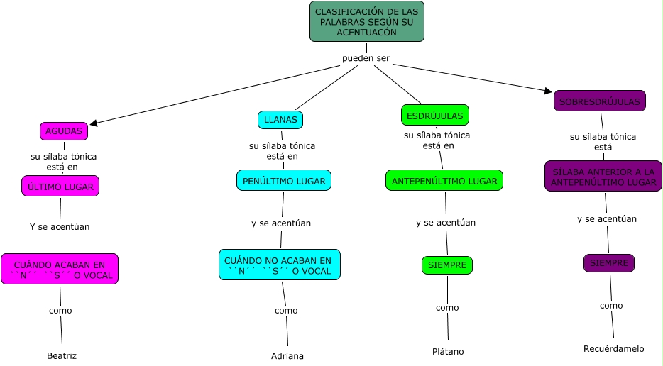 Este Cmap, tiene información relacionada con: LAS PALABRAS SEGÚN SU ACENTUACIÓ´-Adriana, CLASIFICACIÓN DE LAS PALABRAS SEGÚN SU ACENTUACÓN pueden ser ESDRÚJULAS, SIEMPRE como Plátano, ANTEPENÚLTIMO LUGAR y se acentúan SIEMPRE, SÍLABA ANTERIOR A LA ANTEPENÚLTIMO LUGAR y se acentúan SIEMPRE, ÚLTIMO LUGAR Y se acentúan CUÁNDO ACABAN EN ``N´´ ``S´´ O VOCAL, CLASIFICACIÓN DE LAS PALABRAS SEGÚN SU ACENTUACÓN pueden ser LLANAS, AGUDAS su sílaba tónica está en ÚLTIMO LUGAR, PENÚLTIMO LUGAR y se acentúan CUÁNDO NO ACABAN EN ``N´´ ``S´´ O VOCAL, ESDRÚJULAS su sílaba tónica está en ANTEPENÚLTIMO LUGAR, CUÁNDO NO ACABAN EN ``N´´ ``S´´ O VOCAL como Adriana, SOBRESDRÚJULAS su sílaba tónica está SÍLABA ANTERIOR A LA ANTEPENÚLTIMO LUGAR, CLASIFICACIÓN DE LAS PALABRAS SEGÚN SU ACENTUACÓN pueden ser AGUDAS, LLANAS su sílaba tónica está en PENÚLTIMO LUGAR, SIEMPRE como Recuérdamelo, CLASIFICACIÓN DE LAS PALABRAS SEGÚN SU ACENTUACÓN pueden ser SOBRESDRÚJULAS, CUÁNDO ACABAN EN ``N´´ ``S´´ O VOCAL como Beatriz