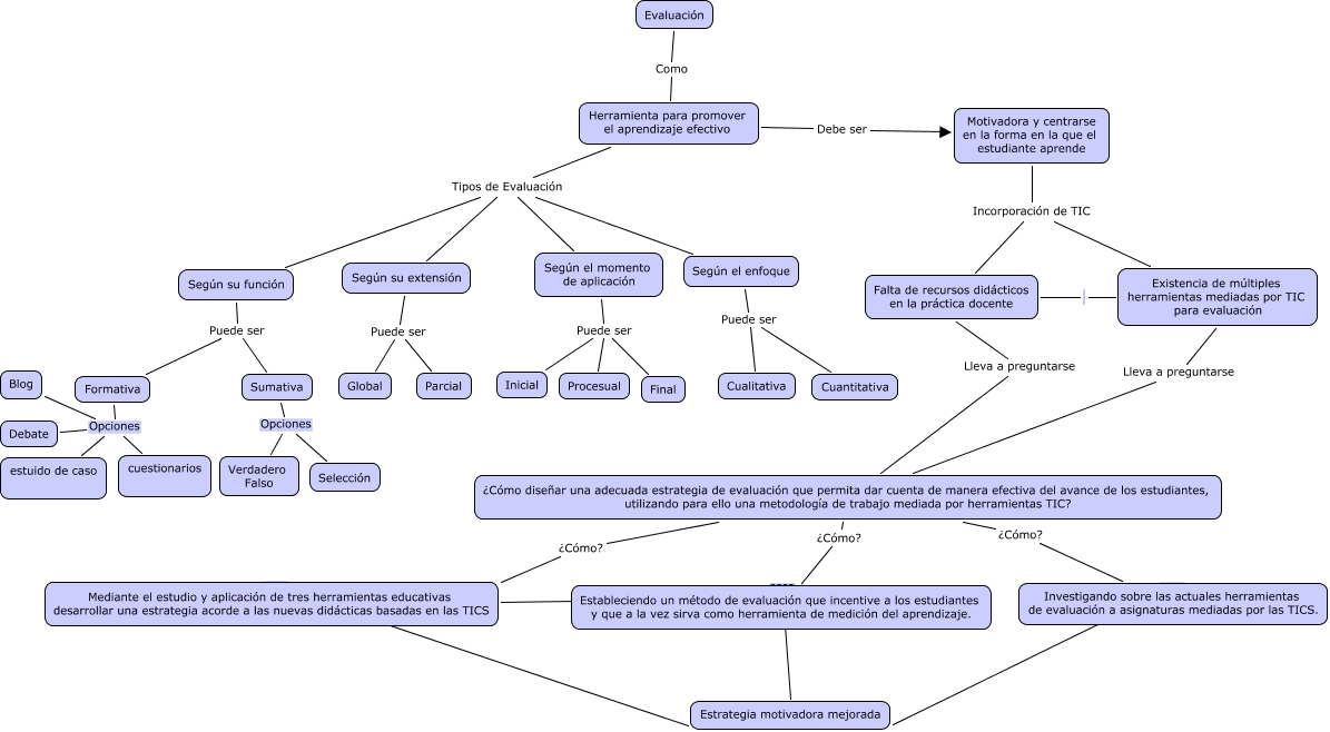 Este Cmap, tiene información relacionada con: Grupo 7 Luis F. Sarmiento, J. Albeiro Cantillo, Camilo Rubiano, Según el momento de aplicación Puede ser Final, Mediante el estudio y aplicación de tres herramientas educativas desarrollar una estrategia acorde a las nuevas didácticas basadas en las TICS ???? Estrategia motivadora mejorada, Motivadora y centrarse en la forma en la que el estudiante aprende Incorporación de TIC Falta de recursos didácticos en la práctica docente, ¿Cómo diseñar una adecuada estrategia de evaluación que permita dar cuenta de manera efectiva del avance de los estudiantes, utilizando para ello una metodología de trabajo mediada por herramientas TIC? ¿Cómo? Mediante el estudio y aplicación de tres herramientas educativas desarrollar una estrategia acorde a las nuevas didácticas basadas en las TICS, Investigando sobre las actuales herramientas de evaluación a asignaturas mediadas por las TICS. ???? Estrategia motivadora mejorada, Motivadora y centrarse en la forma en la que el estudiante aprende Incorporación de TIC Existencia de múltiples herramientas mediadas por TIC para evaluación, Según su función Puede ser Formativa, Estableciendo un método de evaluación que incentive a los estudiantes y que a la vez sirva como herramienta de medición del aprendizaje. ???? Estrategia motivadora mejorada, ¿Cómo diseñar una adecuada estrategia de evaluación que permita dar cuenta de manera efectiva del avance de los estudiantes, utilizando para ello una metodología de trabajo mediada por herramientas TIC? ¿Cómo? Estableciendo un método de evaluación que incentive a los estudiantes y que a la vez sirva como herramienta de medición del aprendizaje., Herramienta para promover el aprendizaje efectivo Tipos de Evaluación Según su función, Formativa Opciones cuestionarios, Formativa Opciones estuido de caso, Formativa Opciones Blog, Sumativa Opciones Selección, Herramienta para promover el aprendizaje efectivo Tipos de Evaluación Según su extensión, ¿Cómo diseñar una adecuada estrategia de evaluación que permita dar cuenta de manera efectiva del avance de los estudiantes, utilizando para ello una metodología de trabajo mediada por herramientas TIC? ¿Cómo? Investigando sobre las actuales herramientas de evaluación a asignaturas mediadas por las TICS., Formativa Opciones Debate, Sumativa Opciones Verdadero Falso, Según su extensión Puede ser Parcial, ¿Cómo diseñar una adecuada estrategia de evaluación que permita dar cuenta de manera efectiva del avance de los estudiantes, utilizando para ello una metodología de trabajo mediada por herramientas TIC? Lleva a preguntarse Falta de recursos didácticos en la práctica docente