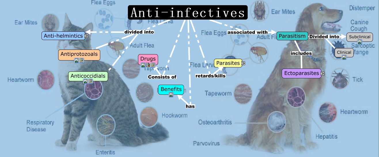This Concept Map, created with IHMC CmapTools, has information related to: Antiinfectives In Veterinary Medicine, Anti-infectives divided into Antiprotozoals, Ectoparasites consists of Ticks, Anti-helmintics should only be used after considering Withdrawal Times, Anti-infectives has Benefits, Anti-infectives Consists of Drugs, Anti-infectives divided into Anticoccidials, Ectoparasites consists of Fleas, Parasites like Toxicara, Anti-helmintics includes Antitrematodal, Anti-helmintics includes Anticestodal, Anti-infectives associated with Parasitism, Anti-infectives retards/kills Parasites, Parasites like Hypoderma, Parasitism includes Ectoparasites, Ectoparasites consists of Mites, Parasitism Divided into Clinical, Anti-infectives divided into Anti-helmintics, Anti-helmintics should only be used after considering Resistance, Parasites like Heartworm, Parasitism Divided into Subclinical