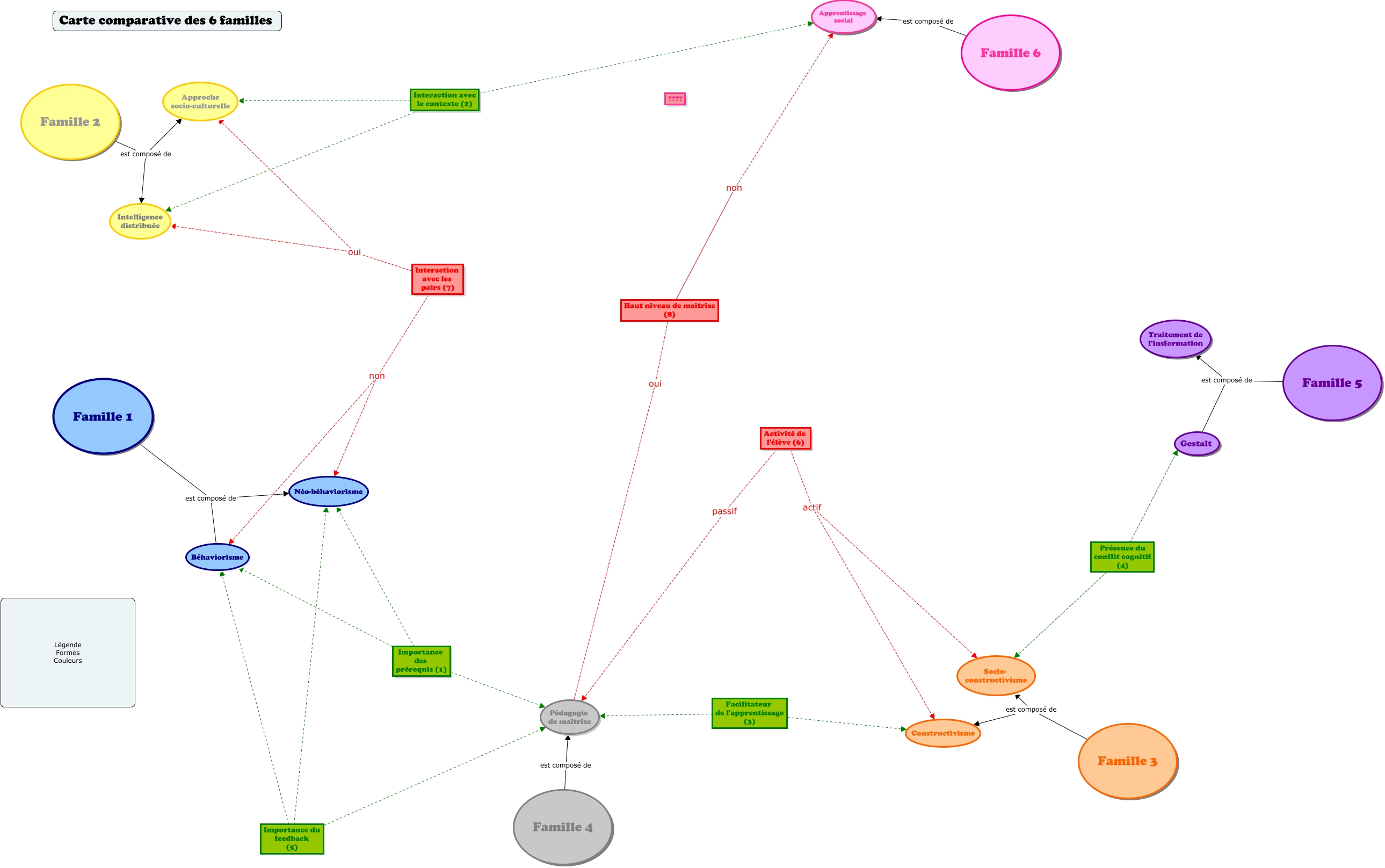 Cette carte de concepts créée avec IHMC CmapTools traite de: Carte comparative des 6 familles de l'équipe AU_Equipe_79_C, Activité de l'élève (6) actif Socio- constructivisme, Activité de l'élève (6) actif Constructivisme, Présence du conflit cognitif (4) Socio- constructivisme, Importance du feedback (5) Béhaviorisme, Importance des prérequis (1) Néo-béhaviorisme, Haut niveau de maitrise (8) non Apprentissage social, Famille 4 est composé de Pédagogie de maîtrise, Haut niveau de maitrise (8) oui Pédagogie de maîtrise, Présence du conflit cognitif (4) Gestalt, Interaction avec les pairs (7) oui Approche socio-culturelle, Famille 5 est composé de Traitement de l'insformation, Famille 2 est composé de Intelligence distribuée, Activité de l'élève (6) passif Pédagogie de maîtrise, Importance du feedback (5) Pédagogie de maîtrise, Interaction avec les pairs (7) non Béhaviorisme, Importance des prérequis (1) Pédagogie de maîtrise, Famille 5 est composé de Gestalt, Facilitateur de l'apprentissage (3) Constructivisme, Famille 6 est composé de Apprentissage social, Facilitateur de l'apprentissage (3) Pédagogie de maîtrise