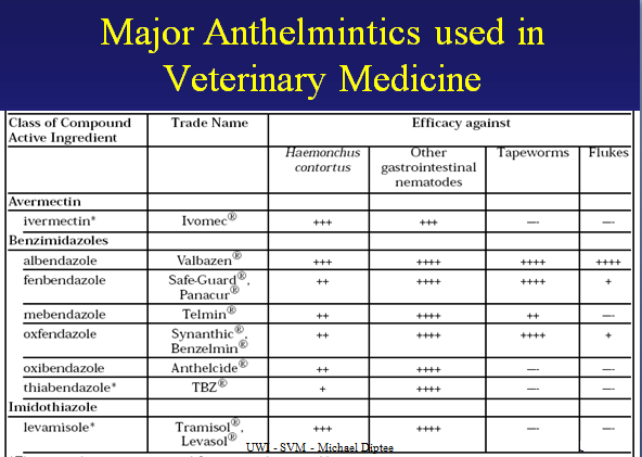 Albendazole.png Fenbendazole I.png Fenbendazole II.png Ivermectin.png Levamisole.png Major Anthelminthics.png Major Anthelminthics in Vet Med.png Mebendazole.png Oxfendazole.png Withdrawal Times of Common Anthelminthics.png