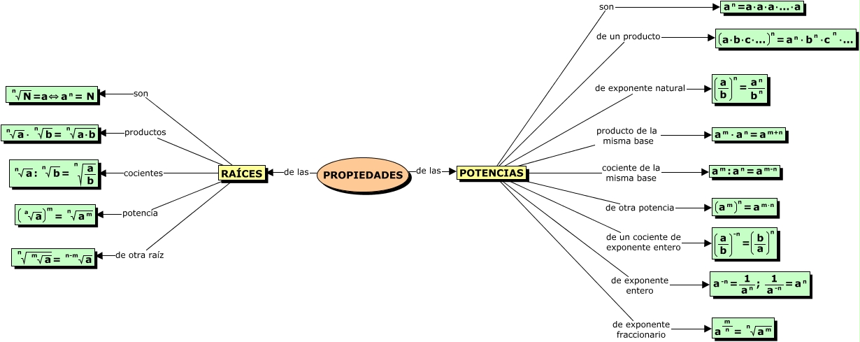 Este Cmap, tiene información relacionada con: ESO2-VERÓNICA_CARTAGENA-PROPIEDADES_DE_POTENCIAS_Y_RAÍCES, POTENCIAS son <math xmlns="http://www.w3.org/1998/Math/MathML"> <mrow> <mmultiscripts> <mtext> a </mtext> <none/> <mtext> n </mtext> </mmultiscripts> <mtext> =a⋅a⋅a⋅...⋅a </mtext> </mrow> </math>, POTENCIAS de otra potencia <math xmlns="http://www.w3.org/1998/Math/MathML"> <mmultiscripts> <mfenced open="(" close=")"> <mmultiscripts> <mtext> a </mtext> <none/> <mtext> m </mtext> </mmultiscripts> </mfenced> <none/> <mtext> n </mtext> </mmultiscripts> <mtext> = </mtext> <mmultiscripts> <mtext> a </mtext> <none/> <mtext> m⋅n </mtext> </mmultiscripts> </math>, POTENCIAS producto de la misma base <math xmlns="http://www.w3.org/1998/Math/MathML"> <mrow> <mmultiscripts> <mtext> a </mtext> <none/> <mtext> m </mtext> </mmultiscripts> <mtext> ⋅ </mtext> <mmultiscripts> <mtext> a </mtext> <none/> <mtext> n </mtext> </mmultiscripts> <mtext> = </mtext> <mmultiscripts> <mtext> a </mtext> <none/> <mtext> m+n </mtext> </mmultiscripts> </mrow> </math>, RAÍCES potencia <math xmlns="http://www.w3.org/1998/Math/MathML"> <mmultiscripts> <mfenced open="(" close=")"> <mmultiscripts> <msqrt> <mtext> a </mtext> </msqrt> <none/> <none/> <mprescripts/> <none/> <mtext> a </mtext> </mmultiscripts> </mfenced> <none/> <mtext> m </mtext> </mmultiscripts> <mtext> = </mtext> <mmultiscripts> <msqrt> <mmultiscripts> <mtext> a </mtext> <none/> <mtext> m </mtext> </mmultiscripts> </msqrt> <none/> <none/> <mprescripts/> <none/> <mtext> n </mtext> </mmultiscripts> </math>, POTENCIAS de exponente entero <math xmlns="http://www.w3.org/1998/Math/MathML"> <mrow> <mmultiscripts> <mtext> a </mtext> <none/> <mtext> -n </mtext> </mmultiscripts> <mtext> = </mtext> <mfrac> <mtext> 1 </mtext> <mmultiscripts> <mtext> a </mtext> <none/> <mtext> n </mtext> </mmultiscripts> </mfrac> <mtext> ; </mtext> <mfrac> <mtext> 1 </mtext> <mmultiscripts> <mtext> a </mtext> <none/> <mtext> -n </mtext> </mmultiscripts> </mfrac> <mtext> = </mtext> <mmultiscripts> <mtext> a </mtext> <none/> <mtext> n </mtext> </mmultiscripts> </mrow> </math>, POTENCIAS cociente de la misma base <math xmlns="http://www.w3.org/1998/Math/MathML"> <mrow> <mmultiscripts> <mtext> a </mtext> <none/> <mtext> m </mtext> </mmultiscripts> <mtext> : </mtext> <mmultiscripts> <mtext> a </mtext> <none/> <mtext> n </mtext> </mmultiscripts> <mtext> = </mtext> <mmultiscripts> <mtext> a </mtext> <none/> <mtext> m-n </mtext> </mmultiscripts> </mrow> </math>, PROPIEDADES de las POTENCIAS, RAÍCES productos <math xmlns="http://www.w3.org/1998/Math/MathML"> <mrow> <mmultiscripts> <msqrt> <mtext> a </mtext> </msqrt> <none/> <none/> <mprescripts/> <none/> <mtext> n </mtext> </mmultiscripts> <mtext> ⋅ </mtext> <mmultiscripts> <msqrt> <mtext> b </mtext> </msqrt> <none/> <none/> <mprescripts/> <none/> <mtext> n </mtext> </mmultiscripts> <mtext> = </mtext> <mmultiscripts> <msqrt> <mtext> a⋅b </mtext> </msqrt> <none/> <none/> <mprescripts/> <none/> <mtext> n </mtext> </mmultiscripts> </mrow> </math>, RAÍCES cocientes <math xmlns="http://www.w3.org/1998/Math/MathML"> <mrow> <mmultiscripts> <msqrt> <mtext> a </mtext> </msqrt> <none/> <none/> <mprescripts/> <none/> <mtext> n </mtext> </mmultiscripts> <mtext> : </mtext> <mmultiscripts> <msqrt> <mtext> b </mtext> </msqrt> <none/> <none/> <mprescripts/> <none/> <mtext> n </mtext> </mmultiscripts> <mtext> = </mtext> <mmultiscripts> <msqrt> <mfrac> <mtext> a </mtext> <mtext> b </mtext> </mfrac> </msqrt> <none/> <none/> <mprescripts/> <none/> <mtext> n </mtext> </mmultiscripts> </mrow> </math>, POTENCIAS de un producto <math xmlns="http://www.w3.org/1998/Math/MathML"> <mmultiscripts> <mfenced open="(" close=")"> <mtext> a⋅b⋅c⋅... </mtext> </mfenced> <none/> <mtext> n </mtext> </mmultiscripts> <mtext> = </mtext> <mmultiscripts> <mtext> a </mtext> <none/> <mtext> n </mtext> </mmultiscripts> <mtext> ⋅ </mtext> <mmultiscripts> <mtext> b </mtext> <none/> <mtext> n </mtext> </mmultiscripts> <mtext> ⋅c </mtext> <mmultiscripts> <mtext> </mtext> <none/> <mtext> n </mtext> </mmultiscripts> <mtext> ⋅... </mtext> </math>, PROPIEDADES de las RAÍCES, RAÍCES son <math xmlns="http://www.w3.org/1998/Math/MathML"> <mrow> <mmultiscripts> <msqrt> <mtext> N </mtext> </msqrt> <none/> <none/> <mprescripts/> <none/> <mtext> n </mtext> </mmultiscripts> <mtext> =a⇔ </mtext> <mmultiscripts> <mtext> a </mtext> <none/> <mtext> n </mtext> </mmultiscripts> <mtext> = N </mtext> </mrow> </math>, POTENCIAS de exponente fraccionario <math xmlns="http://www.w3.org/1998/Math/MathML"> <mrow> <mmultiscripts> <mtext> a </mtext> <none/> <mrow> <mfrac> <mtext> m </mtext> <mtext> n </mtext> </mfrac> </mrow> </mmultiscripts> <mtext> = </mtext> <mmultiscripts> <msqrt> <mmultiscripts> <mtext> a </mtext> <none/> <mtext> m </mtext> </mmultiscripts> </msqrt> <none/> <none/> <mprescripts/> <none/> <mtext> n </mtext> </mmultiscripts> </mrow> </math>, POTENCIAS de un cociente de exponente entero <math xmlns="http://www.w3.org/1998/Math/MathML"> <mrow> <mmultiscripts> <mfenced open="(" close=")"> <mfrac> <mtext> a </mtext> <mtext> b </mtext> </mfrac> </mfenced> <none/> <mtext> -n </mtext> </mmultiscripts> <mtext> = </mtext> <mmultiscripts> <mfenced open="(" close=")"> <mfrac> <mtext> b </mtext> <mtext> a </mtext> </mfrac> </mfenced> <none/> <mtext> n </mtext> </mmultiscripts> </mrow> </math>, POTENCIAS de exponente natural <math xmlns="http://www.w3.org/1998/Math/MathML"> <mmultiscripts> <mfenced open="(" close=")"> <mfrac> <mtext> a </mtext> <mtext> b </mtext> </mfrac> </mfenced> <none/> <mtext> n </mtext> </mmultiscripts> <mtext> = </mtext> <mfrac> <mmultiscripts> <mtext> a </mtext> <none/> <mtext> n </mtext> </mmultiscripts> <mrow> <mmultiscripts> <mtext> b </mtext> <none/> <mtext> n </mtext> </mmultiscripts> </mrow> </mfrac> </math>, RAÍCES de otra raíz <math xmlns="http://www.w3.org/1998/Math/MathML"> <mmultiscripts> <msqrt> <mmultiscripts> <msqrt> <mtext> a </mtext> 