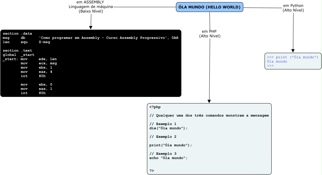 Esse mapa conceitual, produzido no IHMC CmapTools, tem a informação relacionada a: 02. exemplo do hello world, ÓLA MUNDO (HELLO WORLD) em Python (Alto Nível) >>> print ('Óla mundo') Óla mundo >>>, ÓLA MUNDO (HELLO WORLD) em PHP (Alto Nível) <?php // Qualquer uma dos três comandos monstram a mensagem // Exemplo 1 die("Óla mundo"); // Exemplo 2 print("Óla mundo"); // Exemplo 3 echo "Óla mundo"; ?>, ÓLA MUNDO (HELLO WORLD) em ASSEMBLY Linguagem de máquina (Baixo Nível) section .data msg db 'Como programar em Assembly - Curso Assembly Progressivo', 0AH len equ $-msg section .text global _start _start: mov edx, len mov ecx, msg mov ebx, 1 mov eax, 4 int 80h mov ebx, 0 mov eax, 1 int 80h