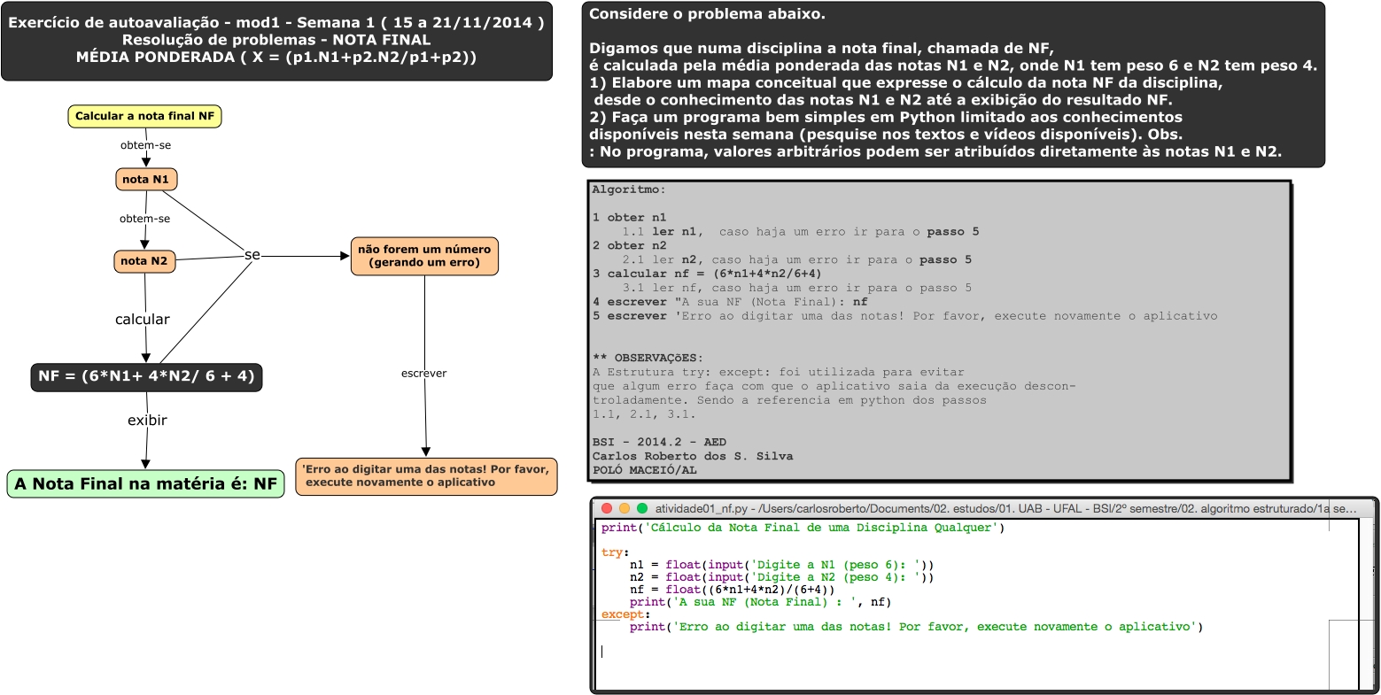 Esse mapa conceitual, produzido no IHMC CmapTools, tem a informação relacionada a: 00. exercicio autoavaliacao - mod 1 - problema - media, nota N1 obtem-se nota N2, nota N1 se não forem um número (gerando um erro), nota N2 se não forem um número (gerando um erro), NF = (6*N1+ 4*N2/ 6 + 4) se não forem um número (gerando um erro), NF = (6*N1+ 4*N2/ 6 + 4) exibir A Nota Final na matéria é: NF, nota N2 calcular NF = (6*N1+ 4*N2/ 6 + 4), não forem um número (gerando um erro) escrever 'Erro ao digitar uma das notas! Por favor, execute novamente o aplicativo, Calcular a nota final NF obtem-se nota N1