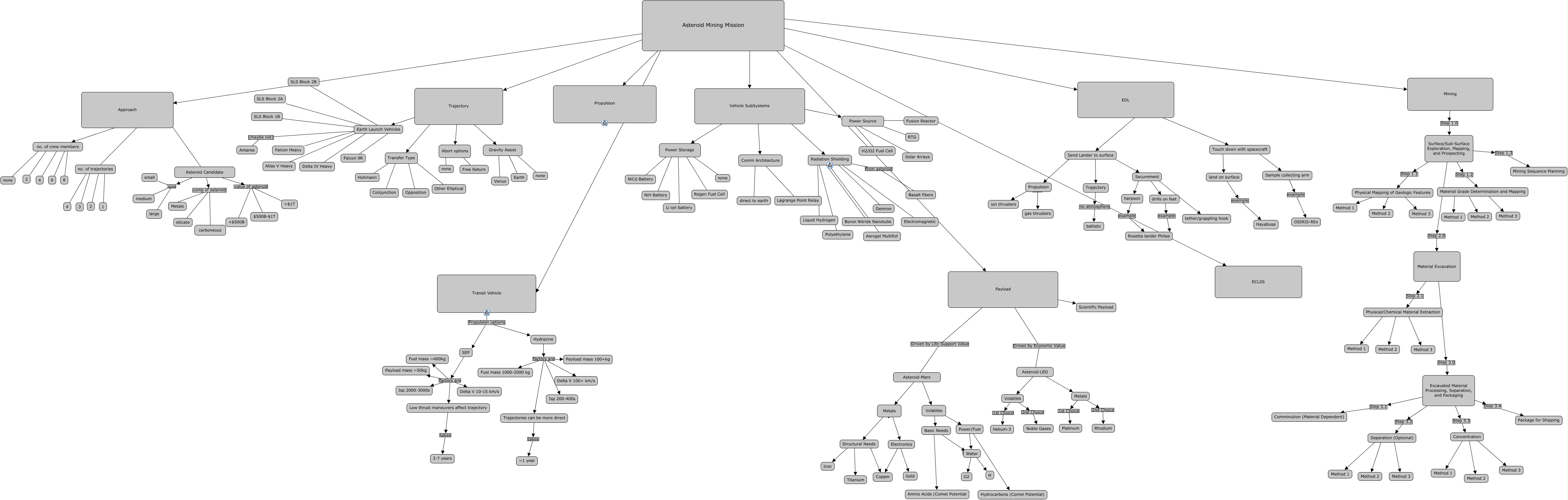 This Concept Map, created with IHMC CmapTools, has information related to: Cmap V1.6.cmap.cmap, SEP factors are Fuel mass ~400kg, Power Storage ???? NiH Battery, Structural Needs ???? Copper, Send Lander to surface ???? Securement, Asteroid Mining Mission ???? Payload, Electronics ???? Gold, no. of crew members ???? none, Abort options ???? none, Physical/Chemical Material Extraction ???? Method 1, Hydrazine factors are Isp 200-400s, Metals ???? Electronics, Hydrazine factors are Fuel mass 1000-2000 kg, Send Lander to surface ???? Propulsion, Basic Needs ???? Amino Acids (Comet Potential, Vehicle SubSystems ???? Comm Architecture, Material Excavation Step 2.1 Physical/Chemical Material Extraction, Earth Launch Vehicles ???? Falcon 9R, Asteroid Candidate value of asteroid >$1T, Metals ???? Structural Needs, Vehicle SubSystems ???? Radiation Shielding
