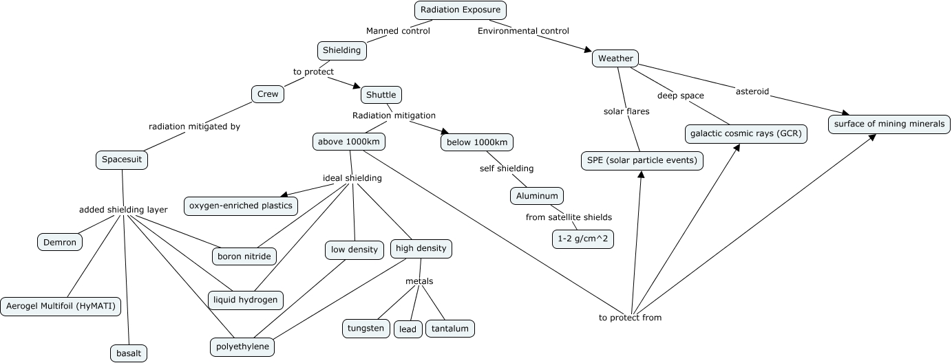 This Concept Map, created with IHMC CmapTools, has information related to: Radiation Exposure.cmap, Spacesuit added shielding layer Demron, Weather asteroid surface of mining minerals, Shuttle Radiation mitigation above 1000km, boron nitride added shielding layer Aerogel Multifoil (HyMATI), above 1000km ideal shielding boron nitride, above 1000km to protect from surface of mining minerals, Shielding to protect Crew, liquid hydrogen added shielding layer basalt, polyethylene added shielding layer basalt, below 1000km self shielding Aluminum, Spacesuit added shielding layer Aerogel Multifoil (HyMATI), Radiation Exposure Manned control Shielding, Radiation Exposure Environmental control Weather, liquid hydrogen added shielding layer Aerogel Multifoil (HyMATI), Weather solar flares SPE (solar particle events), above 1000km ideal shielding high density, high density ???? polyethylene, Crew radiation mitigated by Spacesuit, above 1000km to protect from galactic cosmic rays (GCR), Shuttle Radiation mitigation below 1000km