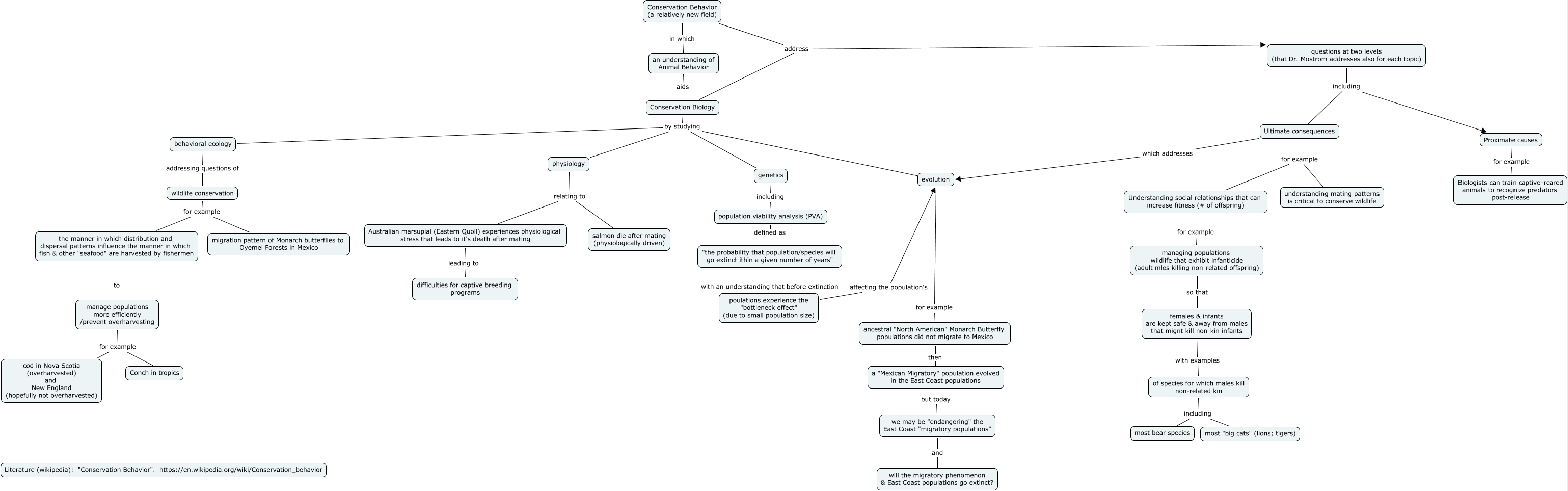 This Concept Map, created with IHMC CmapTools, has information related to: Conservation Behavior, poulations experience the "bottleneck effect" (due to small population size) affecting the population's evolution, managing populations wildlife that exhibit infanticide (adult mles killing non-related offspring) so that females & infants are kept safe & away from males that mignt kill non-kin infants, physiology relating to salmon die after mating (physiologically driven), "the probability that population/species will go extinct ithin a given number of years" with an understanding that before extinction poulations experience the "bottleneck effect" (due to small population size), of species for which males kill non-related kin including most bear species, Conservation Behavior (a relatively new field) address questions at two levels (that Dr. Mostrom addresses also for each topic), Ultimate consequences for example understanding mating patterns is critical to conserve wildlife, females & infants are kept safe & away from males that mignt kill non-kin infants with examples of species for which males kill non-related kin, population viability analysis (PVA) defined as "the probability that population/species will go extinct ithin a given number of years", Proximate causes for example Biologists can train captive-reared animals to recognize predators post-release, cod in Nova Scotia (overharvested) and New England (hopefully not overharvested) for example manage populations more efficiently /prevent overharvesting, Conservation Biology address questions at two levels (that Dr. Mostrom addresses also for each topic), wildlife conservation for example migration pattern of Monarch butterflies to Oyemel Forests in Mexico, we may be "endangering" the East Coast "migratory populations" and will the migratory phenomenon & East Coast populations go extinct?, cod in Nova Scotia (overharvested) and New England (hopefully not overharvested) for example Conch in tropics, an understanding of Animal Behavior aids Conservation Biology, genetics including population viability analysis (PVA), questions at two levels (that Dr. Mostrom addresses also for each topic) including Ultimate consequences, Conservation Biology by studying physiology, the manner in which distribution and dispersal patterns influence the manner in which fish & other "seafood" are harvested by fishermen to manage populations more efficiently /prevent overharvesting