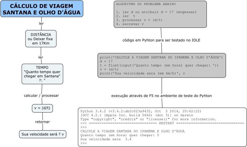 Esse mapa conceitual, produzido no IHMC CmapTools, tem a informação relacionada a: 01. exemplo - aula presencial, TEMPO "Quanto tempo quer chegar em Santana" ?: " calcular / processar v = (d/t), v = (d/t) retornar Sua velocidade será ? v, DISTÂNCIA ou Deixar fixa em 17Km ler TEMPO "Quanto tempo quer chegar em Santana" ?: ", CÁLCULO DE VIAGEM SANTANA E OLHO D'ÁGUA ler DISTÂNCIA ou Deixar fixa em 17Km, ALGORITMO DO PROBLEMA ABAIXO 1. ler d ou atribuir d = 17 (engessar) 2. ler t 3. processar v = (d/t) 4. escrever v código em Pyhton para ser testado no IDLE print('CALCULE A VIAGEM SANTANA DO IPANEMA E OLHO D'ÁGUA') d = 17 t = float(input('Quanto tempo (em hora) quer chegar: ')) v = (d/t) print('Sua velocidade sera (em km/h)', v, print('CALCULE A VIAGEM SANTANA DO IPANEMA E OLHO D'ÁGUA') d = 17 t = float(input('Quanto tempo (em hora) quer chegar: ')) v = (d/t) print('Sua velocidade sera (em km/h)', v execução através de F5 no ambiente de teste do Pyhton Python 3.4.2 (v3.4.2:ab2c023a9432, Oct 5 2014, 20:42:22) [GCC 4.2.1 (Apple Inc. build 5666) (dot 3)] on darwin Type "copyright", "credits" or "license()" for more information. >>> ================================ RESTART ================================ >>> CALCULE A VIAGEM SANTANA DO IPANEMA E OLHO D'ÁGUA Quanto tempo (em hora) quer chegar: 5 Sua velocidade sera 3.4 >>>
