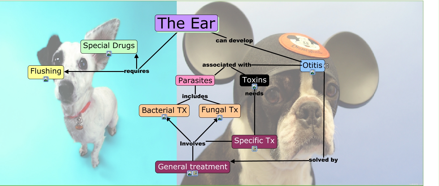 This Concept Map, created with IHMC CmapTools, has information related to: Management of the Ear, Factors divided into Predisposing, Otitis associated with Parasites, Otitis divided into Otitis Interna, Toxins needs Specific Tx, General treatment Involves Bacterial TX, Parasites includes Fungal Tx, Diagnosis includes Physical Examination, Otitis associated with Toxins, History may reveal influencing Factors, Otitis Externa confirmed by Diagnosis, Otitis solved by General treatment, General treatment Involves Fungal Tx, Specific Tx Involves Fungal Tx, Otitis divided into Otitis Externa, History gives an idea of Aetiology, Parasites includes Bacterial TX, The Ear requires Flushing, Diagnosis includes Clinical Signs, Diagnosis includes History, Factors divided into Perpetuating