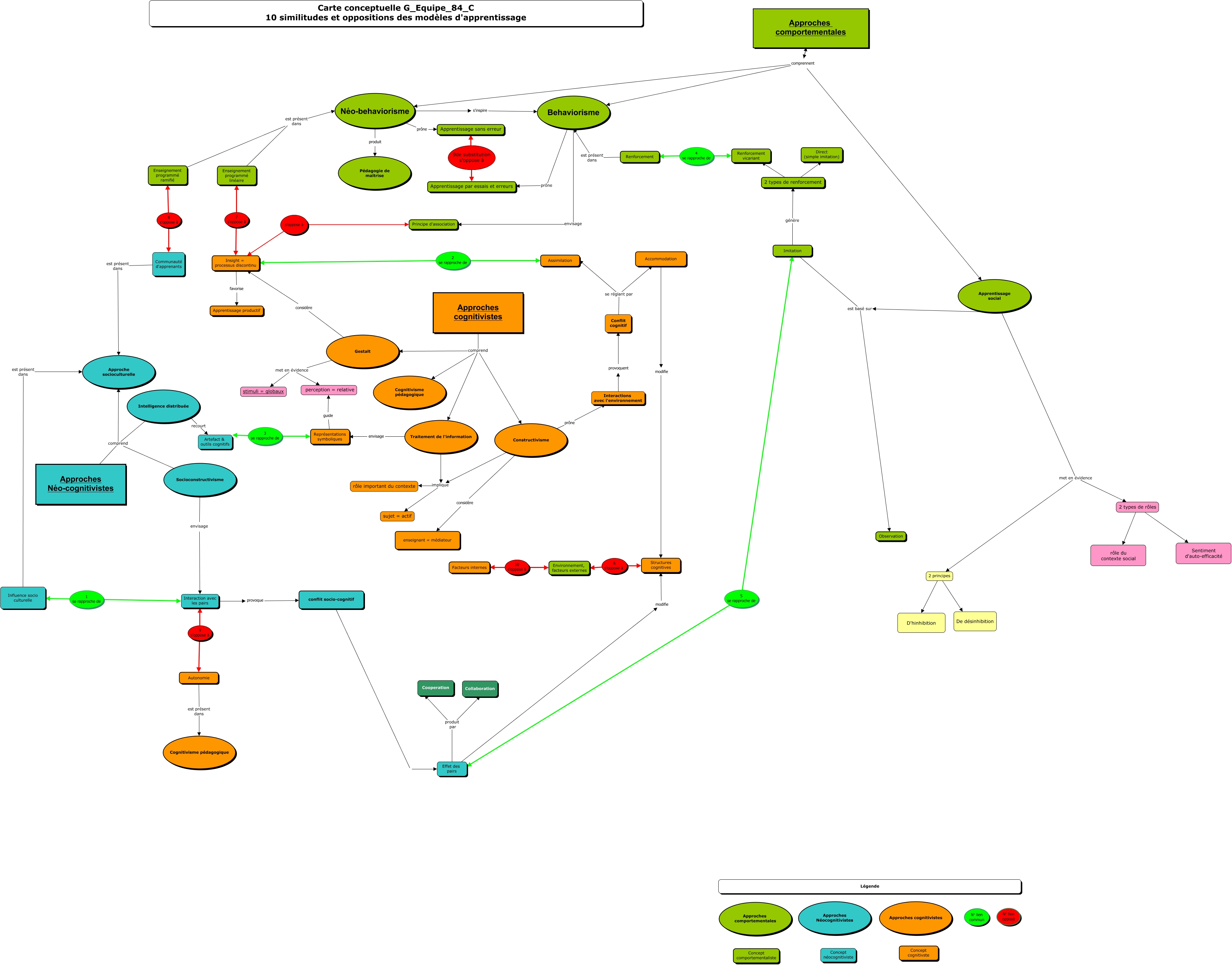 Cette carte de concepts créée avec IHMC CmapTools traite de: 6 familles v5A, Approches cognitivistes comprend Gestalt, Approches cognitivistes comprend Traitement de l'information, 9de substitution s'oppose à Apprentissage sans erreur, 2 types de renforcement Direct (simple imitation), Gestalt considère Insight = processus discontinu, Accommodation modifie Structures cognitives, Approches Néo-cognitivistes comprend Socioconstructivisme, Apprentissage social met en évidence 2 principes, Approches comportementales comprennent Apprentissage social, Effet des pairs produit par Cooperation, Behaviorisme prône Apprentissage par essais et erreurs, Behaviorisme envisage Principe d'association, Traitement de l'information implique rôle important du contexte, Traitement de l'information envisage Représentations symboliques, Socioconstructivisme envisage Interaction avec les pairs, Approches Néo-cognitivistes comprend Approche socioculturelle, 2 principes D'hinhibition, Autonomie est présent dans Cognitivisme pédagogique, Représentations symboliques guide perception = relative, Effet des pairs produit par Collaboration