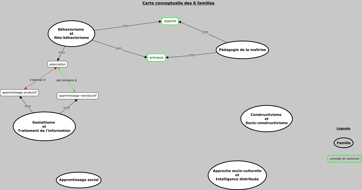 Cette carte de concepts créée avec IHMC CmapTools traite de: Carte des 6 familles_1, Béhaviorisme et Néo-béhaviorisme ???? objectifs, Gestaltisme et Traitement de l'information ???? apprentissage reproductif, Pédagogie de la maîtrise ???? prérequis, Gestaltisme et Traitement de l'information ???? apprentissage productif, Béhaviorisme et Néo-béhaviorisme ???? prérequis, Pédagogie de la maîtrise ???? objectifs, Béhaviorisme et Néo-béhaviorisme ???? association