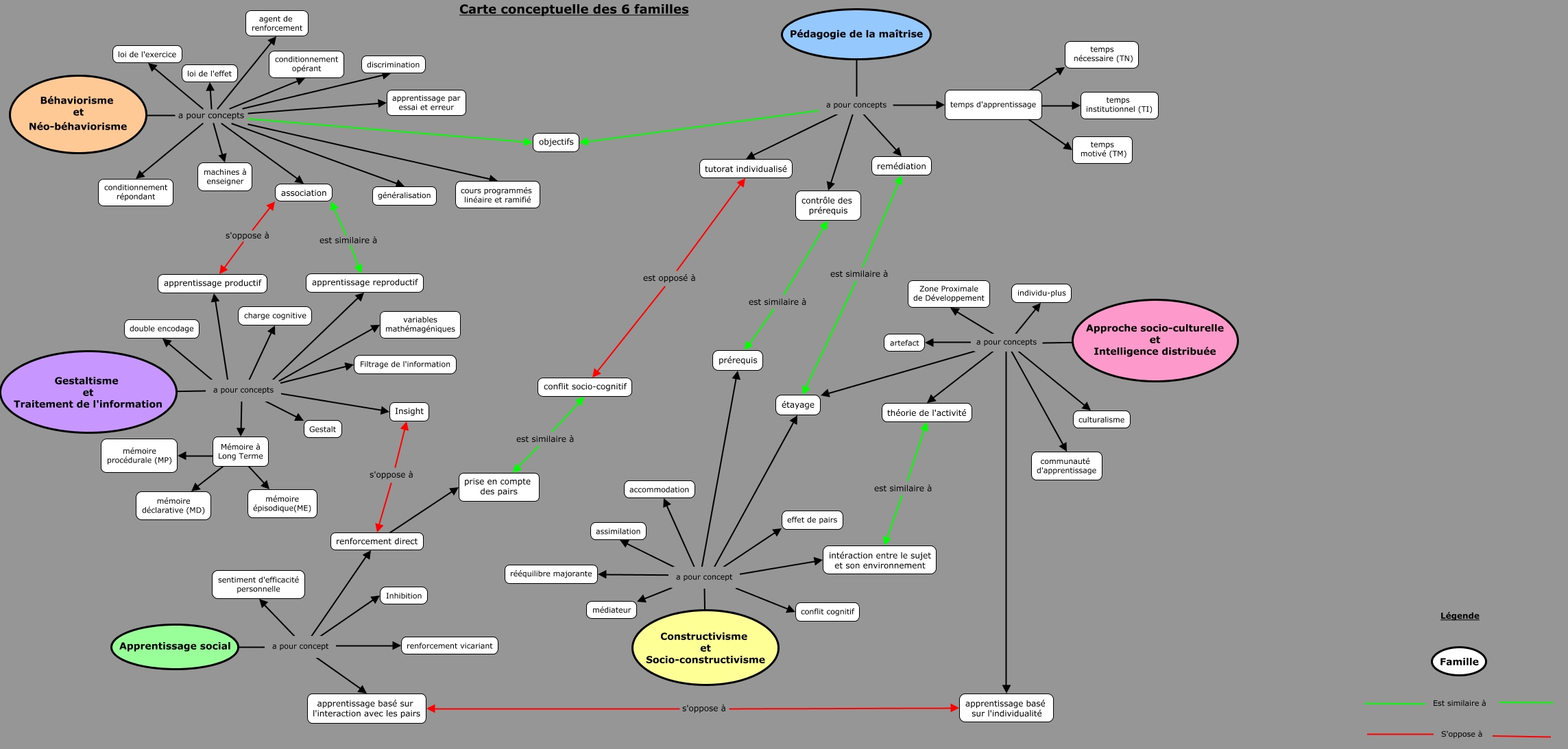 Cette carte de concepts créée avec IHMC CmapTools traite de: Carte des 6 familles_6, a pour concepts a pour concepts temps d'apprentissage, a pour concepts a pour concepts tutorat individualisé, a pour concepts ???? Insight, a pour concepts ???? Mémoire à Long Terme, Est similaire à ????, Béhaviorisme et Néo-béhaviorisme a pour concepts généralisation, Mémoire à Long Terme ???? mémoire procédurale (MP), a pour concepts ???? individu-plus, Béhaviorisme et Néo-béhaviorisme a pour concepts loi de l'effet, a pour concept ???? renforcement direct, S'oppose à ????, Béhaviorisme et Néo-béhaviorisme a pour concepts objectifs, a pour concepts a pour concepts remédiation, Béhaviorisme et Néo-béhaviorisme a pour concepts association, Mémoire à Long Terme ???? mémoire épisodique(ME), Béhaviorisme et Néo-béhaviorisme a pour concepts apprentissage par essai et erreur, a pour concepts ???? objectifs, Béhaviorisme et Néo-béhaviorisme a pour concepts discrimination, a pour concepts ???? artefact, Béhaviorisme et Néo-béhaviorisme a pour concepts conditionnement opérant