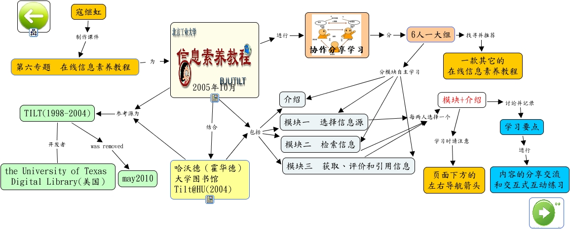 此概念图以 IHMC CmapTools 创建, 内含信息有关于: 第六专题 在线信息素养教程BJUTILT和Tilt@HU(2014), 2005年10月 结合 哈沃德(霍华德) 大学图书馆 Tilt@HU(2004), 模块+介绍 学习时请注意 页面下方的 左右导航箭头, 6人一大组 找寻并推荐 一款其它的 在线信息素养教程, 2005年10月 包括 模块一 选择信息源, 6人一大组 分模块自主学习 模块二 检索信息, 2005年10月 包括 模块二 检索信息, 2005年10月 包括 模块三 获取、评价和引用信息, 6人一大组 分模块自主学习 模块三 获取、评价和引用信息, TILT(1998-2004) 开发者 the University of Texas Digital Library(美国), 2005年10月 进行 协作分享学习, 哈沃德(霍华德) 大学图书馆 Tilt@HU(2004) 包括 介绍, 哈沃德(霍华德) 大学图书馆 Tilt@HU(2004) 包括 模块三 获取、评价和引用信息, 模块三 获取、评价和引用信息 每两人选择一个 模块+介绍, 第六专题 在线信息素养教程 为 2005年10月, 寇继虹 制作课件 第六专题 在线信息素养教程, 模块二 检索信息 每两人选择一个 模块+介绍, 学习要点 进行 内容的分享交流 和交互式互动练习, 2005年10月 参考源为 TILT(1998-2004), 协作分享学习 分 6人一大组, 哈沃德(霍华德) 大学图书馆 Tilt@HU(2004) 包括 模块一 选择信息源