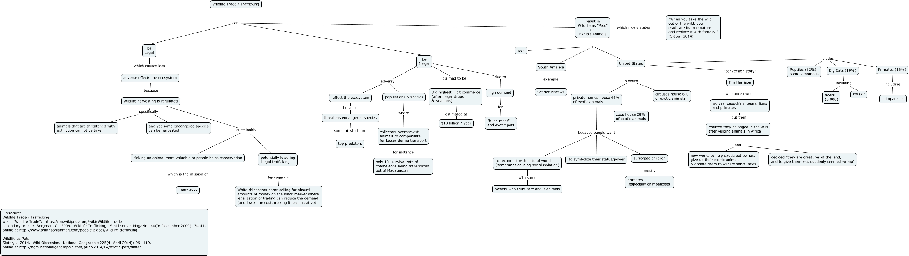 This Concept Map, created with IHMC CmapTools, has information related to: Wildlife as Pets, high demand for "bush-meat" and exotic pets, United States in which zoos house 28% of exotic animals, wolves, capuchins, bears, lions and primates but then realized they belonged in the wild after visiting animals in Africa, United States includes Big Cats (19%), South America example Scarlet Macaws, populations & species where collectors overharvest animals to compensate for losses during transport, Making an animal more valuable to people helps conservation which is the mission of many zoos, realized they belonged in the wild after visiting animals in Africa and decided "they are creatures of the land, and to give them less suddenly seemed wrong", United States includes Primates (16%), private homes house 66% of exotic animals because people want surrogate children, United States in which private homes house 66% of exotic animals, United States in which circuses house 6% of exotic animals, to reconnect with natural world (sometimes causing social isolation) with some owners who truly care about animals, private homes house 66% of exotic animals because people want to reconnect with natural world (sometimes causing social isolation), threatens endangered species some of which are top predators, potentially lowering illegal trafficking for example White rhinoceros horns selling for absurd amounts of money on the black market where legalization of trading can reduce the demand (and lower the cost, making it less lucrative), adverse effects the ecosystem because wildlife harvesting is regulated, be Illegal adversy affect the ecosystem, result in Wildlife as "Pets" or Exhibit Animals which nicely states: "When you take the wild out of the wild, you eradicate its true nature and replace it with fantasy." (Slater, 2014), be Illegal claimed to be 3rd highest illicit commerce (after illegal drugs & weapons)