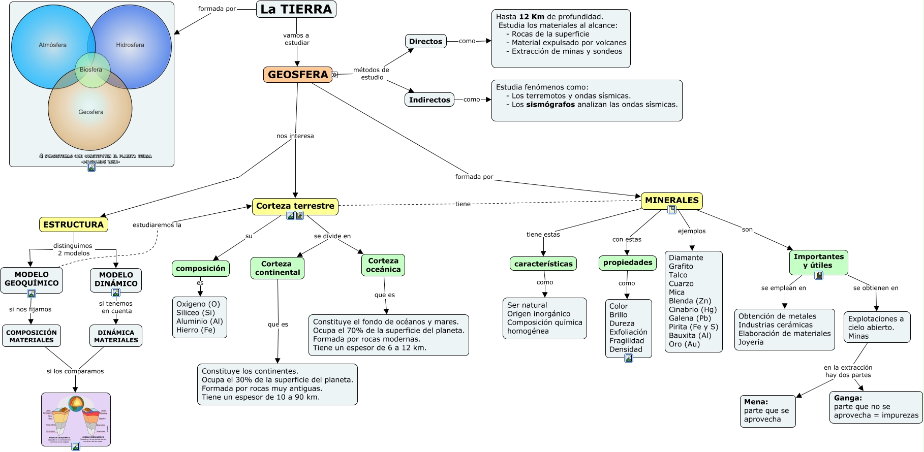Este Cmap, tiene información relacionada con: La geosfera y minerales, RECURSOS su uso provoca IMPACTOS, GEOSFERA formada por MINERALES, GEOSFERA tiene DINÁMICA, Corteza terrestre se divide en Corteza oceánica, GEOSFERA proporciona RECURSOS, COMPOSICIÓN MATERIALES si los comparamos, DINÁMICA MATERIALES si los comparamos, EXTERNO e.g Inundaciones Procesos gravitacionaels, MINERALES e.g Yacimientos minerales Rocas industriales Gemas, ESTRUCTURA distinguimos 2 modelos MODELO GEOQUÍMICO, ENERGÉTICOS e.g Carbón Hidrocarburos Energía nuclear Energía geotérmica, RECURSOS ENERGÉTICOS e.g Energía nuclear Combustibles fósiles, Directos como Hasta 12 Km de profundidad. Estudia los materiales al alcance: - Rocas de la superficie - Material expulsado por volcanes - Extracción de minas y sondeos, DINÁMICA puede ser EXTERNA, Importantes y útiles se emplean en Obtención de metales Industrias cerámicas Elaboración de materiales Joyería, Importantes y útiles se obtienen en Explotaciones a cielo abierto. Minas, Indirectos como Estudia fenómenos como: - Los terremotos y ondas sísmicas. - Los sismógrafos analizan las ondas sísmicas., características como Ser natural Origen inorgánico Composición química homogénea, GEOSFERA provoca RIESGOS, Explotaciones a cielo abierto. Minas en la extracción hay dos partes Ganga: parte que no se aprovecha = impurezas
