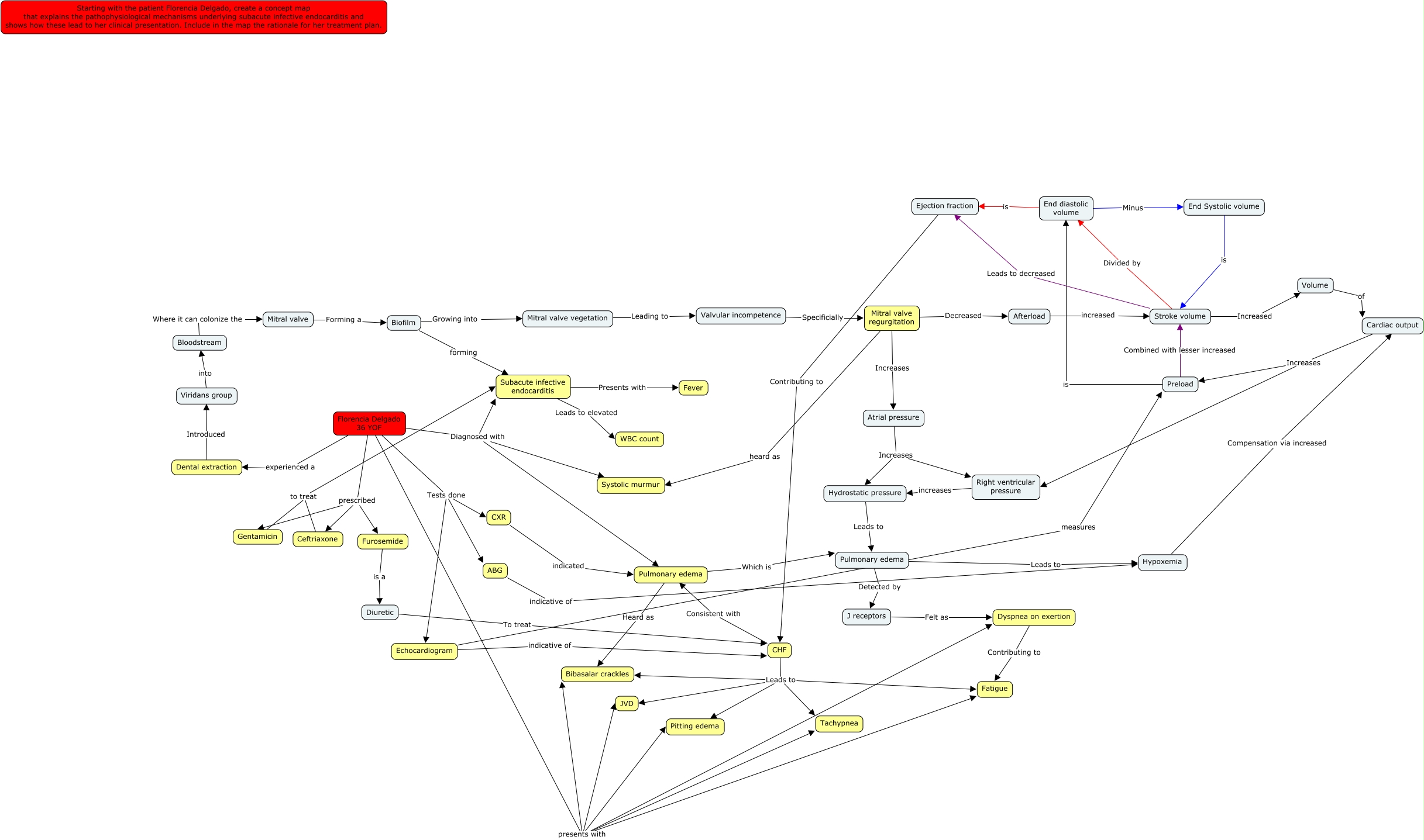 This Concept Map, created with IHMC CmapTools, has information related to: week 18 florencia delgado, Florencia Delgado 36 YOF Diagnosed with Systolic murmur, Afterload increased Stroke volume, End diastolic volume is Ejection fraction, Mitral valve Forming a Biofilm, Mitral valve regurgitation heard as Systolic murmur, Florencia Delgado 36 YOF prescribed Ceftriaxone, Florencia Delgado 36 YOF experienced a Dental extraction, Valvular incompetence Specificially Mitral valve regurgitation, Hydrostatic pressure Leads to Pulmonary edema, End Systolic volume is Stroke volume, Dental extraction Introduced Viridans group, Florencia Delgado 36 YOF presents with JVD, Subacute infective endocarditis Leads to elevated WBC count, Diuretic To treat CHF, Florencia Delgado 36 YOF prescribed Gentamicin, Cardiac output Increases Right ventricular pressure, Ejection fraction Contributing to CHF, ABG indicative of Hypoxemia, Mitral valve regurgitation Increases Atrial pressure, Florencia Delgado 36 YOF presents with Fatigue