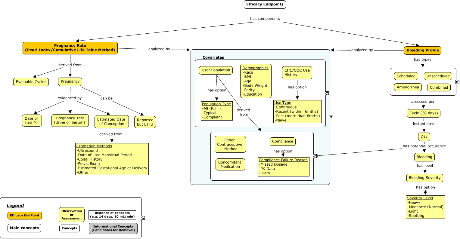 This Concept Map, created with IHMC CmapTools, has information related to: Contraceptives Efficacy Framework - v12, Efficacy Endpoints has components Pregnancy Rate (Pearl Index/Cumulative Life Table Method), Cycle (28 days) instantiates Day, ???? assessed per Cycle (28 days), Estimated Date of Conception derived from Estimation Methods -Ultrasound -Date of Last Menstrual Period -Coital History -Pelvic Exam -Estimated Gestational Age at Delivery -Other, Bleeding Profile has types ????, CHC/COC Use History has option Use Type -Continuous -Recent (within 6mths) -Past (more than 6mths) -Naive, Bleeding Profile analyzed by ????, Pregnancy evidenced by Pregnancy Test (Urine or Serum), User Population has option Population Type -All (PITT) -Typical -Compliant, Bleeding has level Bleeding Severity, Pregnancy Rate (Pearl Index/Cumulative Life Table Method) derived from Pregnancy, Day has potential occurence ????, Day has potential occurence Bleeding, Bleeding Severity has option Severity Level -Heavy -Moderate (Normal) -Light -Spotting, User Population derived from ????, Pregnancy Rate (Pearl Index/Cumulative Life Table Method) analyzed by ????, Compliance has option Compliance Failure Reason -Missed Dosage -PK Data -Diary, Pregnancy evidenced by Estimated Date of Conception, Pregnancy Rate (Pearl Index/Cumulative Life Table Method) derived from Evaluable Cycles, Efficacy Endpoints has components Bleeding Profile