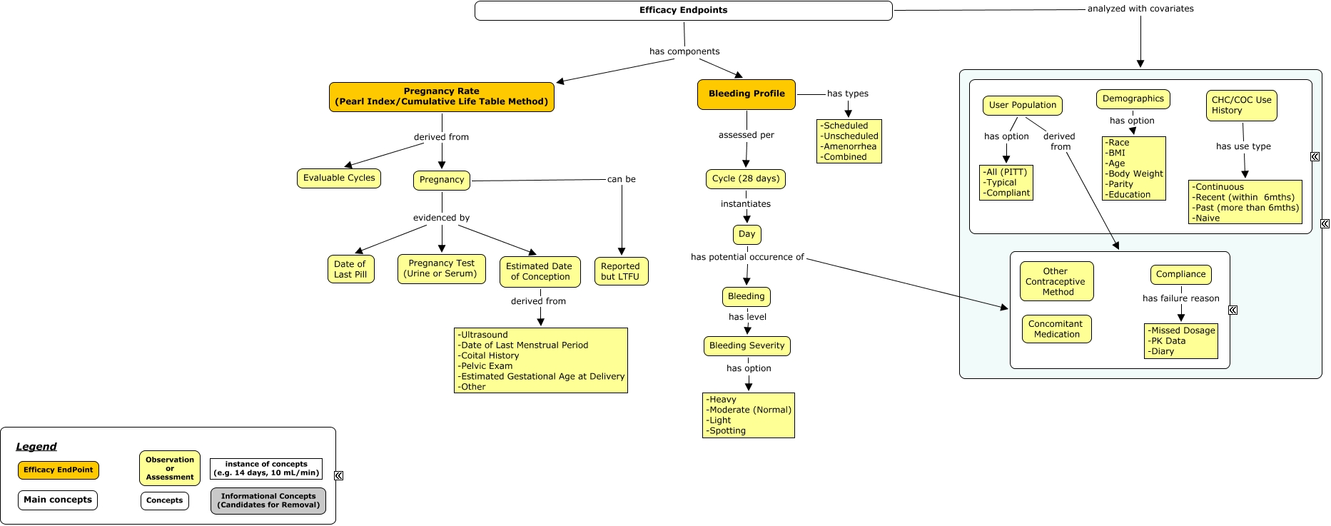 This Concept Map, created with IHMC CmapTools, has information related to: Contraceptives Efficacy Framework - v12ak, Efficacy Endpoints has components Pregnancy Rate (Pearl Index/Cumulative Life Table Method), Bleeding Profile has types -Scheduled -Unscheduled -Amenorrhea -Combined, Estimated Date of Conception derived from -Ultrasound -Date of Last Menstrual Period -Coital History -Pelvic Exam -Estimated Gestational Age at Delivery -Other, Cycle (28 days) instantiates Day, Bleeding Profile assessed per Cycle (28 days), Demographics has option -Race -BMI -Age -Body Weight -Parity -Education, CHC/COC Use History has use type -Continuous -Recent (within 6mths) -Past (more than 6mths) -Naive, User Population has option -All (PITT) -Typical -Compliant, Pregnancy evidenced by Pregnancy Test (Urine or Serum), Day has potential occurence of ????, Pregnancy Rate (Pearl Index/Cumulative Life Table Method) derived from Pregnancy, Bleeding has level Bleeding Severity, Day has potential occurence of Bleeding, User Population derived from ????, Bleeding Severity has option -Heavy -Moderate (Normal) -Light -Spotting, Compliance has failure reason -Missed Dosage -PK Data -Diary, Pregnancy Rate (Pearl Index/Cumulative Life Table Method) derived from Evaluable Cycles, Pregnancy evidenced by Estimated Date of Conception, Pregnancy evidenced by Date of Last Pill, Efficacy Endpoints has components Bleeding Profile