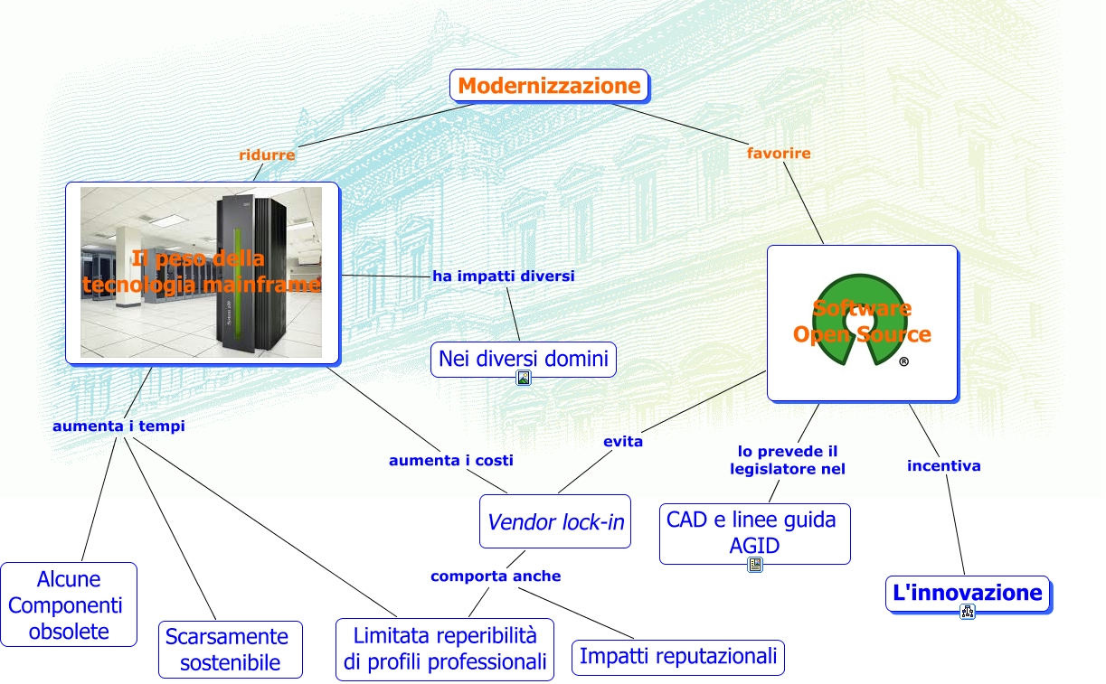 Questa Cmap, creata con IHMC CmapTools, contiene informazioni relative a: Modernizzazione, Il peso della tecnologia mainframe aumenta i costi Vendor lock-in, Il peso della tecnologia mainframe aumenta i tempi Limitata reperibilità di profili professionali, Modernizzazione favorire Software Open Source, Vendor lock-in comporta anche Impatti reputazionali, Software Open Source incentiva L'innovazione, Il peso della tecnologia mainframe aumenta i tempi Alcune Componenti obsolete, Software Open Source evita Vendor lock-in, Software Open Source lo prevede il legislatore nel CAD e linee guida AGID, Modernizzazione ridurre Il peso della tecnologia mainframe, Vendor lock-in comporta anche Limitata reperibilità di profili professionali, Il peso della tecnologia mainframe aumenta i tempi Scarsamente sostenibile, Il peso della tecnologia mainframe ha impatti diversi Nei diversi domini