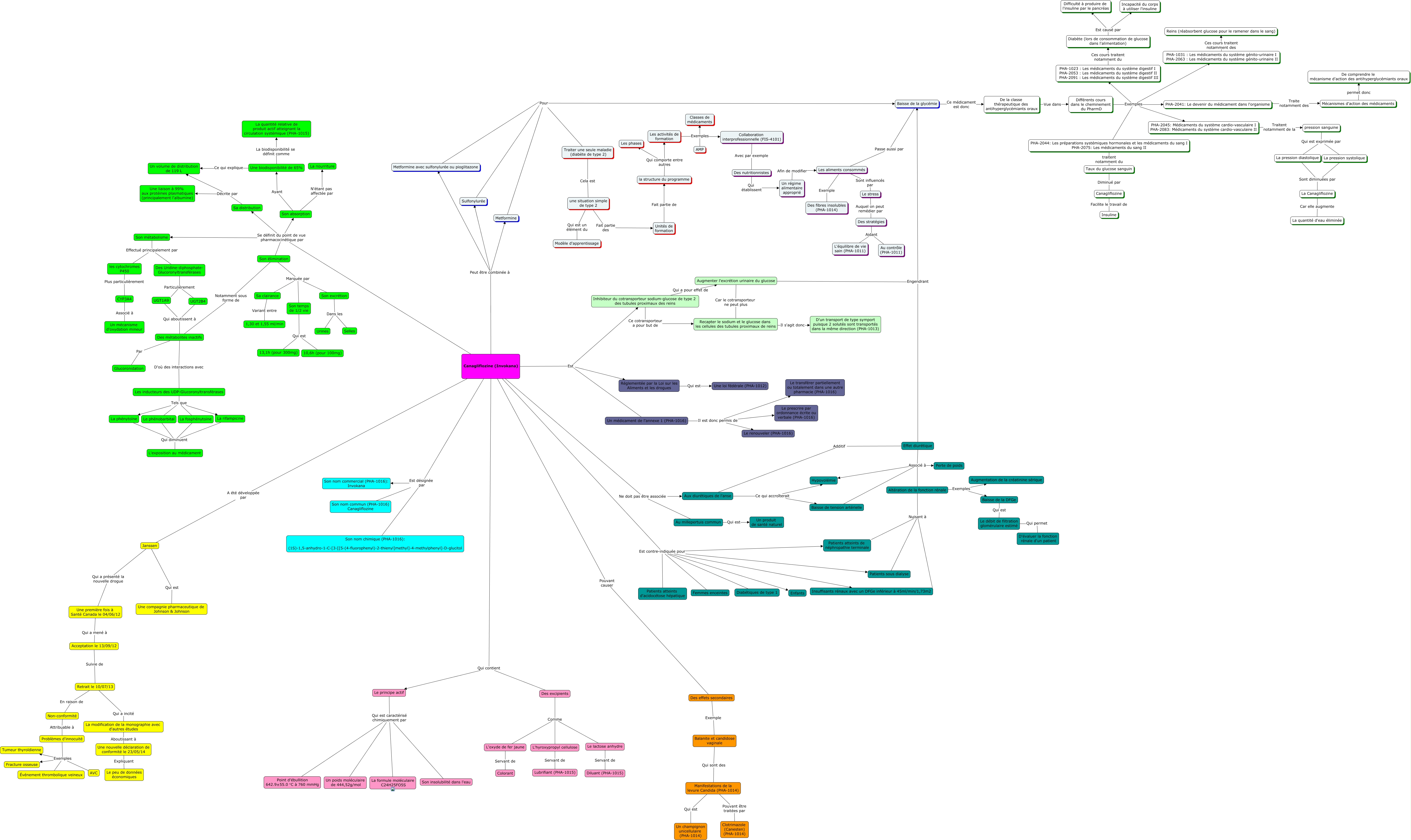 Cette carte de concepts créée avec IHMC CmapTools traite de: Carte conceptuelle- BONNE VERSION, Les aliments consommés Exemple Des fibres insolubles (PHA-1014), Mécanismes d'action des médicaments permet donc De comprendre le mécanisme d'action des antihyperglycémiants oraux, Sa distribution Décrite par Un volume de distribution de 119 L, une situation simple de type 2 Qui est un élément du Modèle d'apprentissage, Traiter une seule maladie (diabète de type 2) Cela est une situation simple de type 2, Non-conformité Attribuable à Problèmes d'innocuité, Canagliflozine (Invokana) Est contre-indiquée pour Patients atteints de néphropathie terminale, Metformine avec sulfonylurée ou pioglitazone Pour Traiter une seule maladie (diabète de type 2), Canagliflozine (Invokana) Est contre-indiquée pour Femmes enceintes, Effet diurétique Associé à Perte de poids, la structure du programme Qui comporte entre autres Les phases, Le stress Auquel on peut remédier par Des stratégies, Les inducteurs des UDP-Glucoronyltransférases Tels que La rifampicine, Réglementée par la Loi sur les Aliments et les drogues Qui est Une loi fédérale (PHA-1012), PHA-2045: Médicaments du système cardio-vasculaire I PHA-2083: Médicaments du système cardio-vasculaire II Traitent notamment de la pression sanguine, Canagliflozine (Invokana) Est Un médicament de l'annexe 1 (PHA-1016), Son élimination Marquée par Sa clairance, Son excrétion Dans les Selles, La rifampicine Qui diminuent L'exposition au médicament, PHA-2041: Le devenir du médicament dans l'organisme Traite notamment des Mécanismes d'action des médicaments