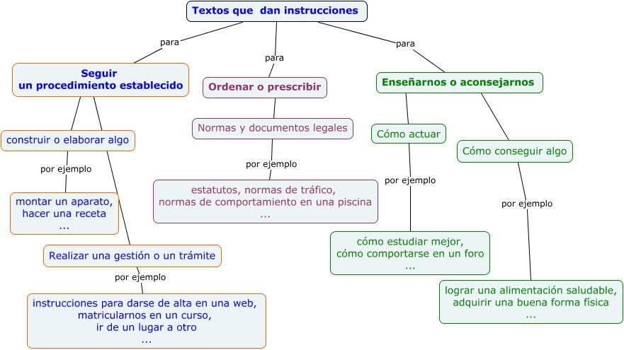 Este Cmap, tiene información relacionada con: TextosInstructivos, Textos que dan instrucciones para Enseñarnos o aconsejarnos, Normas y documentos legales por ejemplo estatutos, normas de tráfico, normas de comportamiento en una piscina ..., Seguir un procedimiento establecido ???? construir o elaborar algo, Textos que dan instrucciones para Ordenar o prescribir, Cómo conseguir algo por ejemplo lograr una alimentación saludable, adquirir una buena forma física ..., Seguir un procedimiento establecido ???? Realizar una gestión o un trámite, Enseñarnos o aconsejarnos ???? Cómo actuar, Cómo actuar por ejemplo cómo estudiar mejor, cómo comportarse en un foro ..., Ordenar o prescribir ???? Normas y documentos legales, Enseñarnos o aconsejarnos ???? Cómo conseguir algo, Realizar una gestión o un trámite por ejemplo instrucciones para darse de alta en una web, matricularnos en un curso, ir de un lugar a otro ..., construir o elaborar algo por ejemplo montar un aparato, hacer una receta ..., Textos que dan instrucciones para Seguir un procedimiento establecido