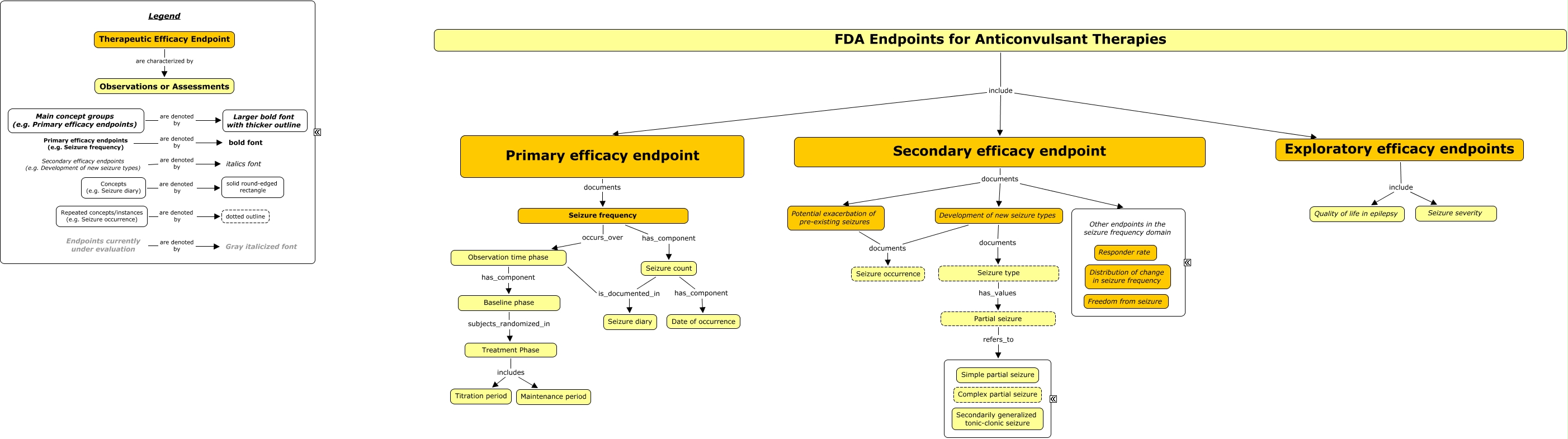 This Concept Map, created with IHMC CmapTools, has information related to: Anticonvulsant-CMAP-v8a.cmap, Potential exacerbation of pre-existing seizures documents Seizure occurrence, Seizure type has_values Partial seizure, Treatment Phase includes Titration period, Repeated concepts/instances (e.g. Seizure occurrence) are denoted by dotted outline, FDA Endpoints for Anticonvulsant Therapies include Secondary efficacy endpoint, Observation time phase is_documented_in Seizure diary, Primary efficacy endpoints (e.g. Seizure frequency) are denoted by bold font, Therapeutic Efficacy Endpoint are characterized by Observations or Assessments, Observation time phase has_component Baseline phase, Primary efficacy endpoint documents Seizure frequency, Partial seizure refers_to Partial seizure subtype, FDA Endpoints for Anticonvulsant Therapies include Primary efficacy endpoint, Seizure count is_documented_in Seizure diary, Concepts (e.g. Seizure diary) are denoted by solid round-edged rectangle, Development of new seizure types documents Seizure occurrence, Seizure frequency occurs_over Observation time phase, Secondary efficacy endpoint documents Other endpoints in seizure frequency domain, Seizure frequency has_component Seizure count, Seizure count has_component Date of occurrence, Treatment Phase includes Maintenance period