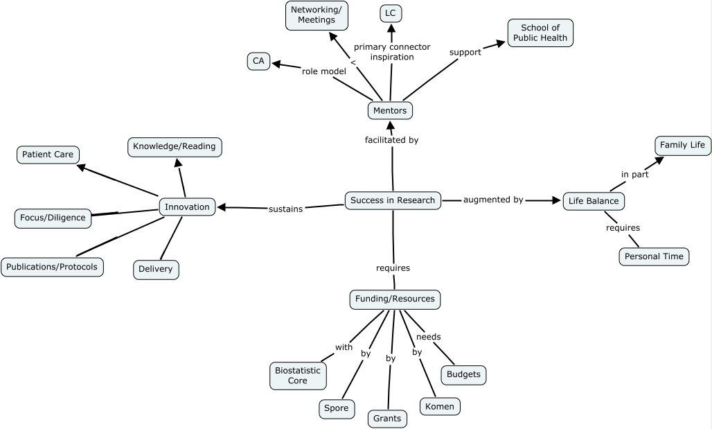 This Concept Map, created with IHMC CmapTools, has information related to: Jill Tichy Map 2, Innovation Patient Care, Mentors primary connector inspiration LC, Mentors < Networking/ Meetings, Funding/Resources with Biostatistic Core, Mentors support School of Public Health, Life Balance in part Family Life, Mentors role model CA, Funding/Resources by Spore, Funding/Resources needs Budgets, Innovation Focus/Diligence, Funding/Resources by Grants, Innovation Delivery, Success in Research facilitated by Mentors, Innovation Publications/Protocols, Innovation Knowledge/Reading, Success in Research augmented by Life Balance, Funding/Resources by Komen, Life Balance requires Personal Time, Success in Research sustains Innovation, Success in Research requires Funding/Resources