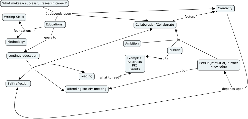 This Concept Map, created with IHMC CmapTools, has information related to: seankearinsuccess, publish results Examples: Abstracts PRJ Grants, What makes a successful research career? It depends upon Collaberation/Collaberate, Persue(Persuit of) further knowledge by attending society meeting, continue education by reading, Creativity depends upon Persue(Persuit of) further knowledge, continue education by Collaberation/Collaberate, Collaberation/Collaberate fosters Creativity, Ambition to publish, Educational goals to continue education, reading what to read? Examples: Abstracts PRJ Grants, What makes a successful research career? It depends upon Educational, Ambition to Persue(Persuit of) further knowledge, Educational foundations in Methodolgy, continue education by attending society meeting, continue education by Self reflection, Educational foundations in Writing Skills, Ambition to Collaberation/Collaberate, What makes a successful research career? It depends upon Creativity, Creativity depends upon Self reflection