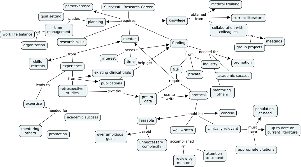 This Concept Map, created with IHMC CmapTools, has information related to: HillaryMaitlandmap2, protocol should be well written, well written accomplished by review by mentors, Successful Research Career requires perserverence, protocol should be feasable, expertise needed for academic success, time management via organization, experience from retrospective studies, expertise needed for promotion, clinically relevant must have up to date on current literature, planning includes goal setting, planning includes time management, mentor needs funding, feasable avoid unneccessary complexity, Successful Research Career requires funding, collaboration with colleagues in meetings, expertise needed for mentoring others, mentor needs time, Successful Research Career requires mentor, experience from existing clinical trials, prelim data use to write protocol