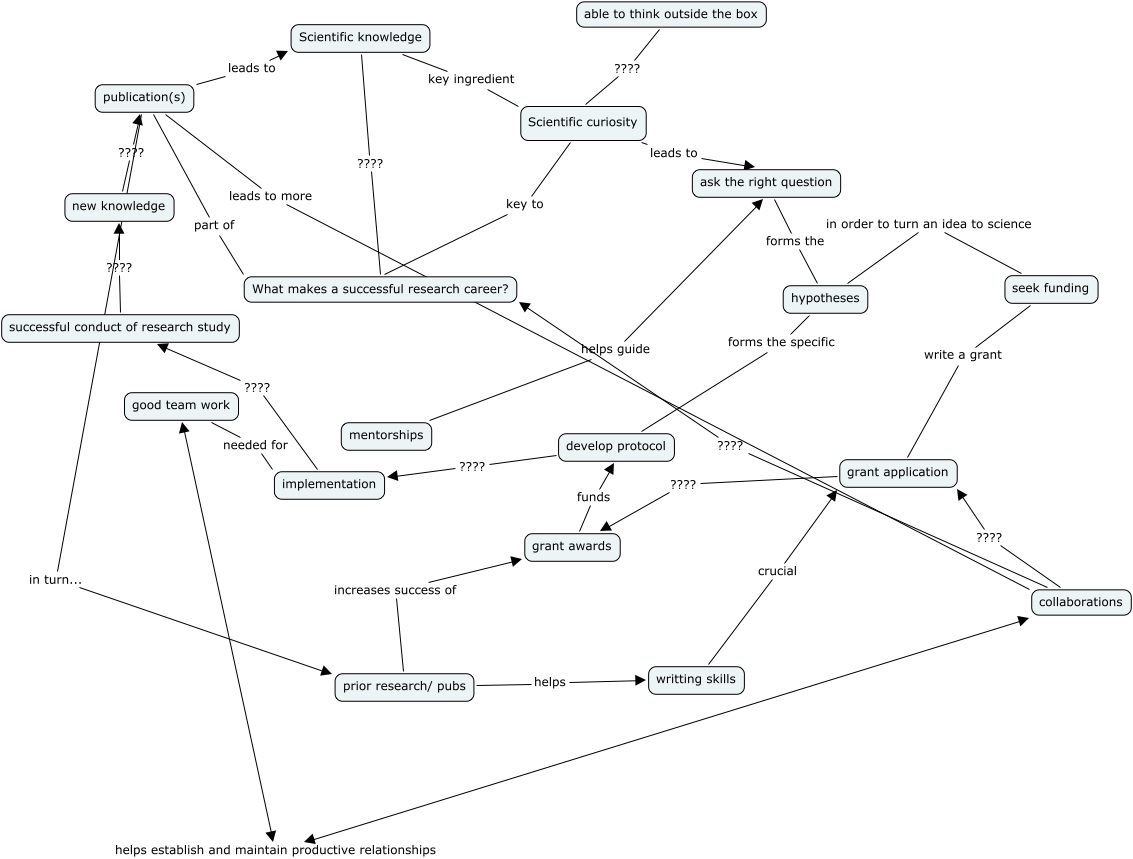 This Concept Map, created with IHMC CmapTools, has information related to: Wong_Map1, publication(s) leads to Scientific knowledge, grant awards funds develop protocol, ask the right question forms the hypotheses, collaborations ???? What makes a successful research career?, Scientific curiosity leads to ask the right question, hypotheses in order to turn an idea to science seek funding, Scientific curiosity key to What makes a successful research career?, successful conduct of research study ???? new knowledge, publication(s) part of What makes a successful research career?, Scientific knowledge ???? What makes a successful research career?, collaborations ???? grant application, seek funding write a grant grant application, grant application ???? grant awards, develop protocol ???? implementation, implementation ???? successful conduct of research study, good team work needed for implementation, able to think outside the box ???? Scientific curiosity, publication(s) leads to more collaborations, hypotheses forms the specific develop protocol, writting skills crucial grant application