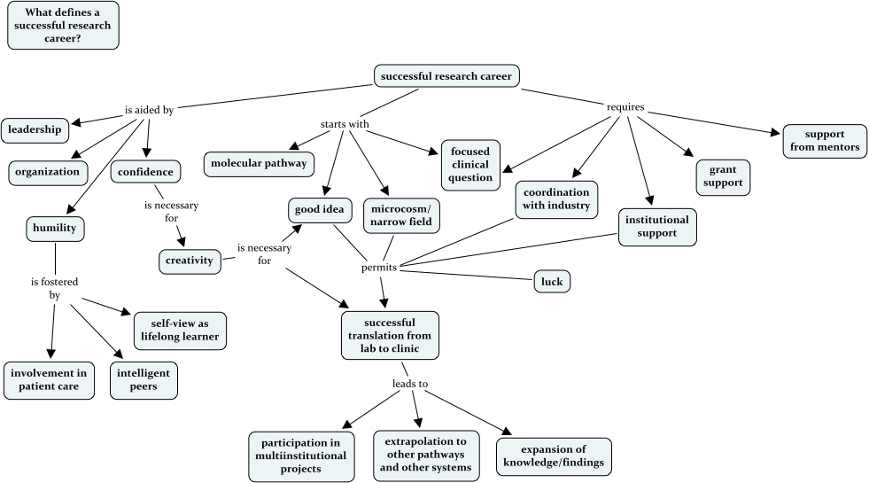 This Concept Map, created with IHMC CmapTools, has information related to: MichaelGrunwaldResearchCareer, successful research career is aided by humility, successful research career requires institutional support, successful research career requires support from mentors, humility is fostered by involvement in patient care, institutional support permits successful translation from lab to clinic, successful research career is aided by confidence, successful research career requires focused clinical question, successful translation from lab to clinic leads to participation in multiinstitutional projects, creativity is necessary for good idea, confidence is necessary for creativity, humility is fostered by self-view as lifelong learner, creativity is necessary for successful translation from lab to clinic, successful research career starts with molecular pathway, coordination with industry permits successful translation from lab to clinic, successful research career is aided by organization, humility is fostered by intelligent peers, successful research career starts with microcosm/ narrow field, successful research career starts with focused clinical question, successful research career starts with good idea, successful research career is aided by leadership