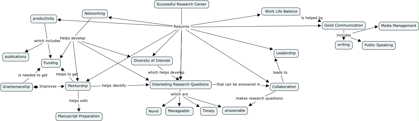 This Concept Map, created with IHMC CmapTools, has information related to: christoswanmap1, Grantsmanship is needed to get Funding, Networking Helps develop Interesting Research Questions, Interesting Research Questions which are answerable, Mentorship helps identify Interesting Research Questions, Successful Research Career Requires Diversity of Interest, Interesting Research Questions that can be answered in Collaboration, Interesting Research Questions which are Manageable, Successful Research Career Requires Leadership, Collaboration leads to Leadership, Successful Research Career Requires Mentorship, Networking Helps develop Diversity of Interest, Successful Research Career Requires productivity, Grantsmanship Improves Mentorship, Networking Helps develop Mentorship, Successful Research Career Requires Interesting Research Questions, Interesting Research Questions which are Novel, Good Communication includes Media Management, productivity which includes Funding, productivity which includes publications, Work Life Balance is helped by Good Communication