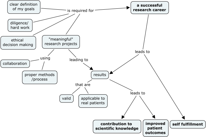 This Concept Map, created with IHMC CmapTools, has information related to: HaeseongParkMap1, diligence/ hard work is required for a successful research career, clear definition of my goals is required for a successful research career, a successful research career leads to results, results that are valid, a successful research career leads to self fulfillment, "meaningful" research projects using proper methods /process, "meaningful" research projects leading to results, ethical decision making is required for a successful research career, "meaningful" research projects is required for a successful research career, results leads to improved patient outcomes, results that are applicable to real patients, results leads to contribution to scientific knowledge, "meaningful" research projects using collaboration