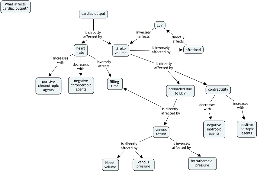 This Concept Map, created with IHMC CmapTools, has information related to: SarahAbbes Tutorial, ESV inversely affects stroke volume, heart rate increases with positive chronotropic agents, cardiac output is directly affected by stroke volume, heart rate decreases with negative chronotropic agents, contractility increases with positive inotropic agents, preloaded due to EDV is directly affected by filling time, venous return is directly affectd by blood volume, stroke volume is directly affected by contractility, stroke volume is directly affected by preloaded due to EDV, heart rate inversely affects filling time, venous return is directly affectd by venous pressure, contractility decreases with negative inotropic agents, venous return is inversely affected by intrathoracic pressure, stroke volume is inversely affected by afterload, afterload directly affects ESV, preloaded due to EDV is directly affected by venous return, cardiac output is directly affected by heart rate