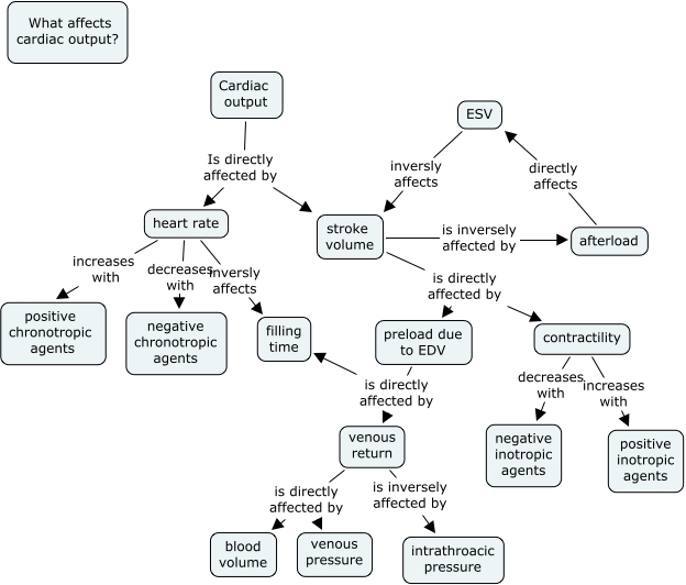 This Concept Map, created with IHMC CmapTools, has information related to: Stephanie Lilla Cardiac output map, Cardiac output Is directly affected by stroke volume, venous return is inversely affected by intrathroacic pressure, stroke volume is directly affected by preload due to EDV, stroke volume is inversely affected by afterload, heart rate decreases with negative chronotropic agents, contractility increases with positive inotropic agents, stroke volume is directly affected by contractility, afterload directly affects ESV, ESV inversly affects stroke volume, contractility decreases with negative inotropic agents, venous return is directly affected by blood volume, venous return is directly affected by venous pressure, preload due to EDV is directly affected by venous return, heart rate increases with positive chronotropic agents, preload due to EDV is directly affected by filling time, Cardiac output Is directly affected by heart rate, heart rate inversly affects filling time