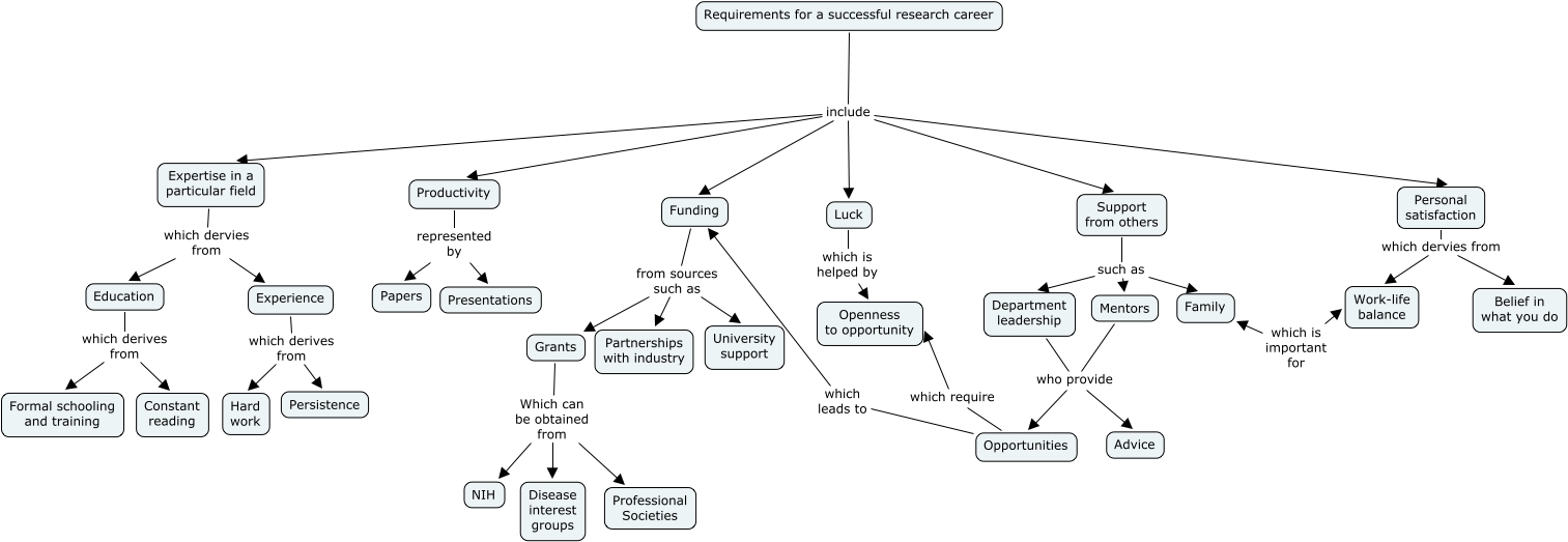 This Concept Map, created with IHMC CmapTools, has information related to: Sung Successful Research Career, Requirements for a successful research career include Luck, Requirements for a successful research career include Funding, Expertise in a particular field which dervies from Education, Grants Which can be obtained from Professional Societies, Funding from sources such as Partnerships with industry, Personal satisfaction which dervies from Work-life balance, Grants Which can be obtained from Disease interest groups, Support from others such as Mentors, Requirements for a successful research career include Personal satisfaction, Productivity represented by Presentations, Department leadership who provide Opportunities, Personal satisfaction which dervies from Belief in what you do, Experience which derives from Hard work, Luck which is helped by Openness to opportunity, Funding from sources such as University support, Productivity represented by Papers, Support from others such as Family, Expertise in a particular field which dervies from Experience, Requirements for a successful research career include Expertise in a particular field, Funding from sources such as Grants