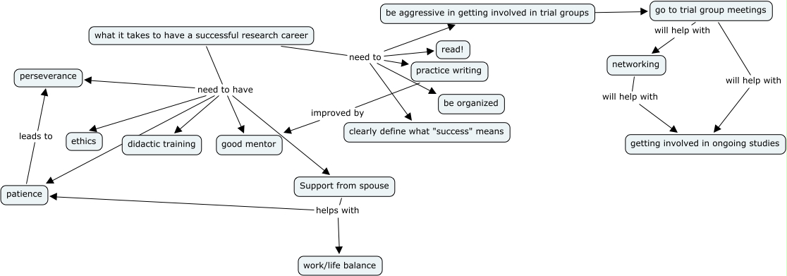 This Concept Map, created with IHMC CmapTools, has information related to: map2, what it takes to have a successful research career need to have perseverance, what it takes to have a successful research career need to have patience, Support from spouse helps with work/life balance, what it takes to have a successful research career need to be organized, Support from spouse helps with patience, go to trial group meetings will help with getting involved in ongoing studies, what it takes to have a successful research career need to be aggressive in getting involved in trial groups, what it takes to have a successful research career need to clearly define what "success" means, what it takes to have a successful research career need to have Support from spouse, what it takes to have a successful research career need to read!, what it takes to have a successful research career need to have ethics, what it takes to have a successful research career need to have didactic training, patience leads to perseverance, what it takes to have a successful research career need to practice writing, be aggressive in getting involved in trial groups ???? go to trial group meetings, what it takes to have a successful research career need to have good mentor, practice writing improved by good mentor, networking will help with getting involved in ongoing studies, go to trial group meetings will help with networking
