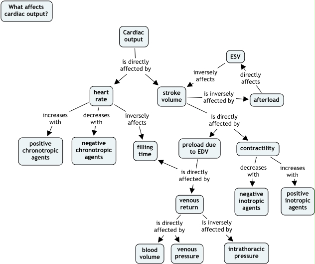 This Concept Map, created with IHMC CmapTools, has information related to: BrandiReevesTutorial, Cardiac output is directly affected by stroke volume, stroke volume is directly affected by preload due to EDV, afterload directly affects ESV, contractility increases with positive inotropic agents, preload due to EDV is directly affected by venous return, preload due to EDV is directly affected by filling time, heart rate inversely affects filling time, venous return is directly affected by venous pressure, heart rate increases with positive chronotropic agents, stroke volume is inversely affected by afterload, stroke volume is directly affected by contractility, ESV inversely affects stroke volume, contractility decreases with negative inotropic agents, venous return is directly affected by blood volume, venous return is inversely affected by intrathoracic pressure, heart rate decreases with negative chronotropic agents, Cardiac output is directly affected by heart rate